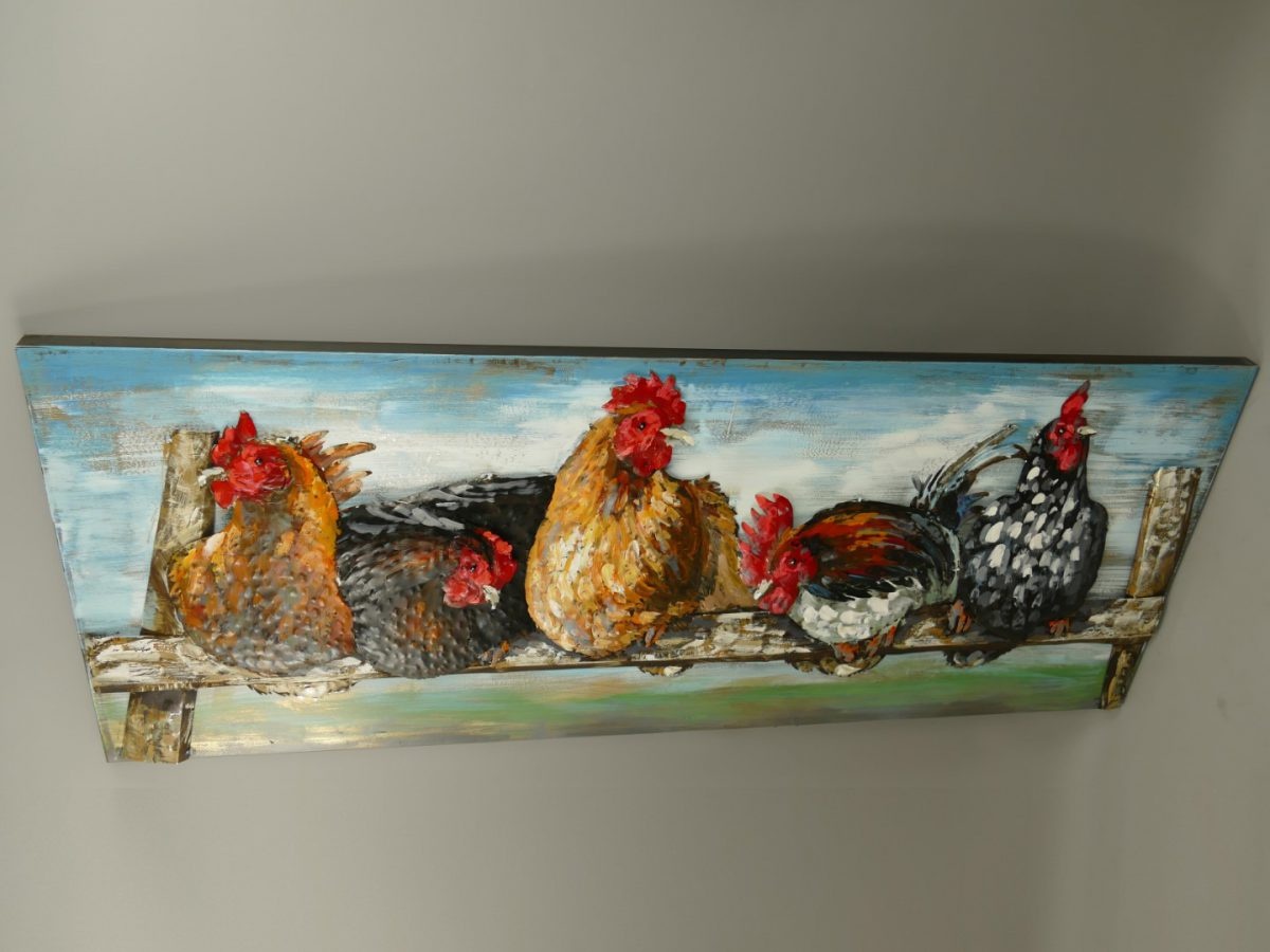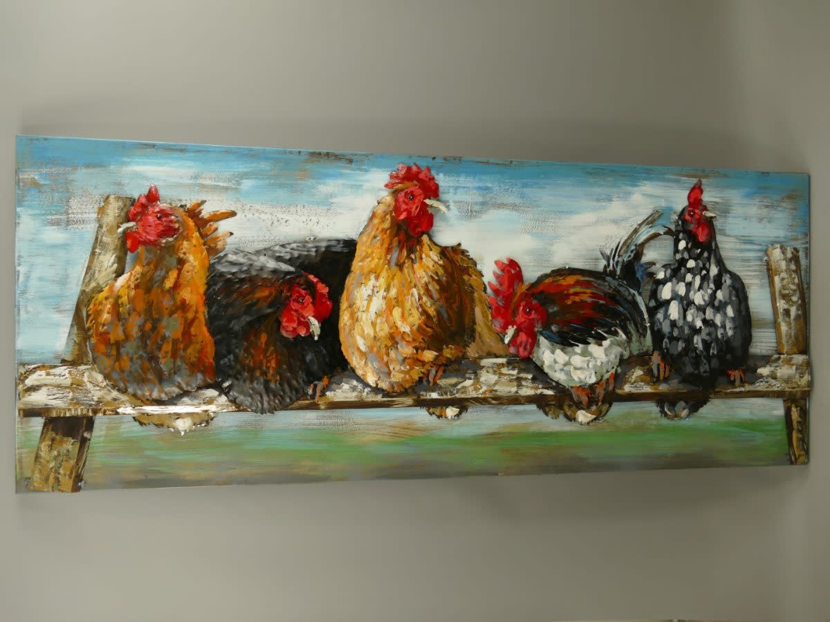 Ein wunderschönes 3D-Metallbild, das vier Hühner auf einem Stock darstellt. Es wurde aus einzelnen Metallstücken gefertigt, die alle von Hand zusammengeschweißt wurden, um einen optimalen 3D-Effekt zu erzielen. Ein schönes Stück Wanddekoration für Ihr Zuhause, draußen unter einem Vordach oder in Ihrem Geschäft. Die Farben und das allgemeine Erscheinungsbild können vom Foto abweichen, da der gesamte Artikel von Menschenhand gefertigt wurde.
