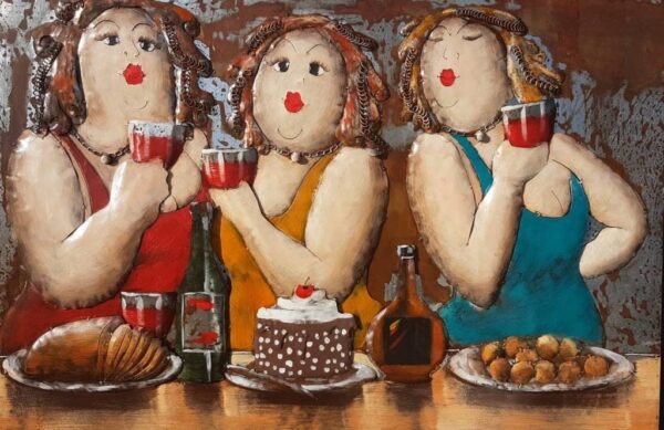 Mit dieser Wanddekoration wird Ihr Zuhause oder Ihr Geschäft wunderschön. Dieses Modell aus Metall mit 3 dicken Damen ist vollständig von Hand gefertigt. Alles an diesem Wandobjekt ist aus Metall, also sowohl der Hintergrund als auch die Figur. Da es handbemalt und hergestellt ist, kann die Farbe leicht vom Foto abweichen, sie sind nie genau gleich. Bei diesen leicht rauen Gemälden kann es immer zu weiteren geringfügigen Abweichungen kommen, manchmal wird dies sogar absichtlich gemacht, um die raue Atmosphäre zu erreichen.