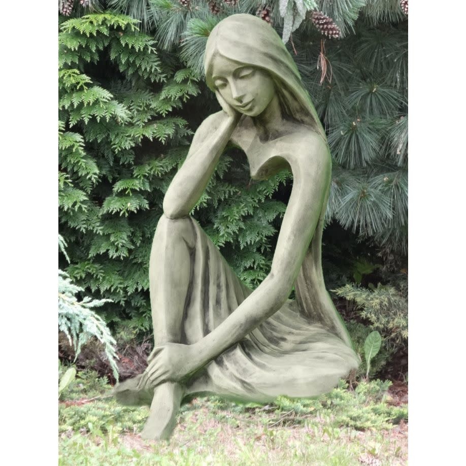Eine besonders schöne und moderne Skulptur einer Dame mit langen Haaren in einer ruhigen Sitzposition. Hergestellt aus bestem Kunststein. Schön detailliert.