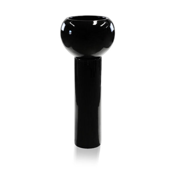 Schöner schwarzer runder konvexer Topf aus Polystone. Dieser große bauchige Topf ist ein schönes Dekorationsstück für Ihr Interieur oder Ihr Geschäft. Sie können diesen wuchtigen Topf in hochglänzendem Schwarz mit Ihren anderen Möbeln in fast jeder modernen Einrichtung kombinieren. Polystone ist ein Material aus Steinsplitt/Pulver, das mit einem Kunstharz vermischt ist. Diese Mischung, kombiniert mit Glasfasermatten, ist ein sehr starkes Material, das ideal für dieses Produkt geeignet ist. Als Finish wurde ein Hochglanzlack verwendet, der mit Autolack verglichen werden kann.