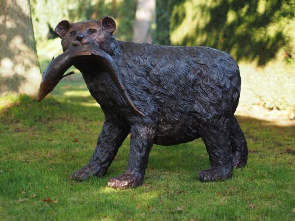 Schöne Statue eines stolzen Bären mit einem gefangenen Fisch im Maul aus echter Bronze. Die Bronze dieser Skulptur hat einen garantierten Kupferanteil von 75%, was ihre Langlebigkeit und ihr Aussehen erheblich verbessert.