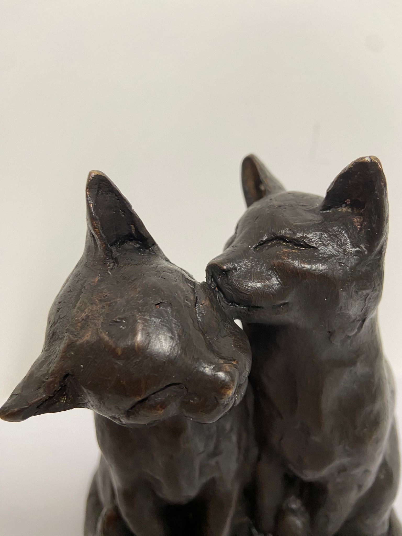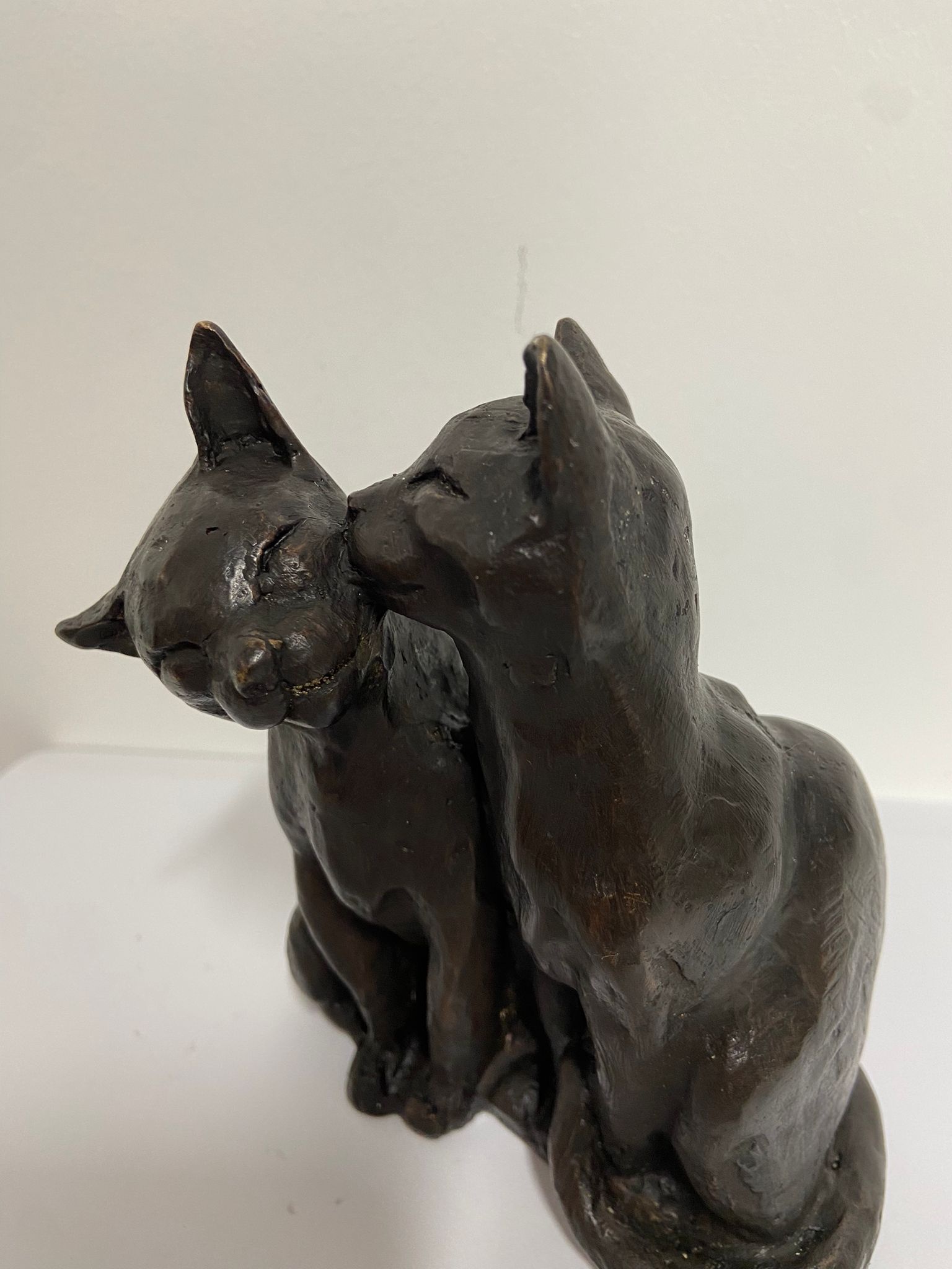 Schöne moderne zeitgenössische Skulptur eines Katzenpaares in kleinem Format. Hergestellt aus 100% hochwertiger Bronze mit einem Mindestkupfergehalt von 75%, was eine sehr lange Lebensdauer und keine unansehnlichen Flecken garantiert. Ein schönes und langlebiges Dekorationsobjekt für Haus, Geschäft oder Garten sowie ein wunderbares Geschenk.