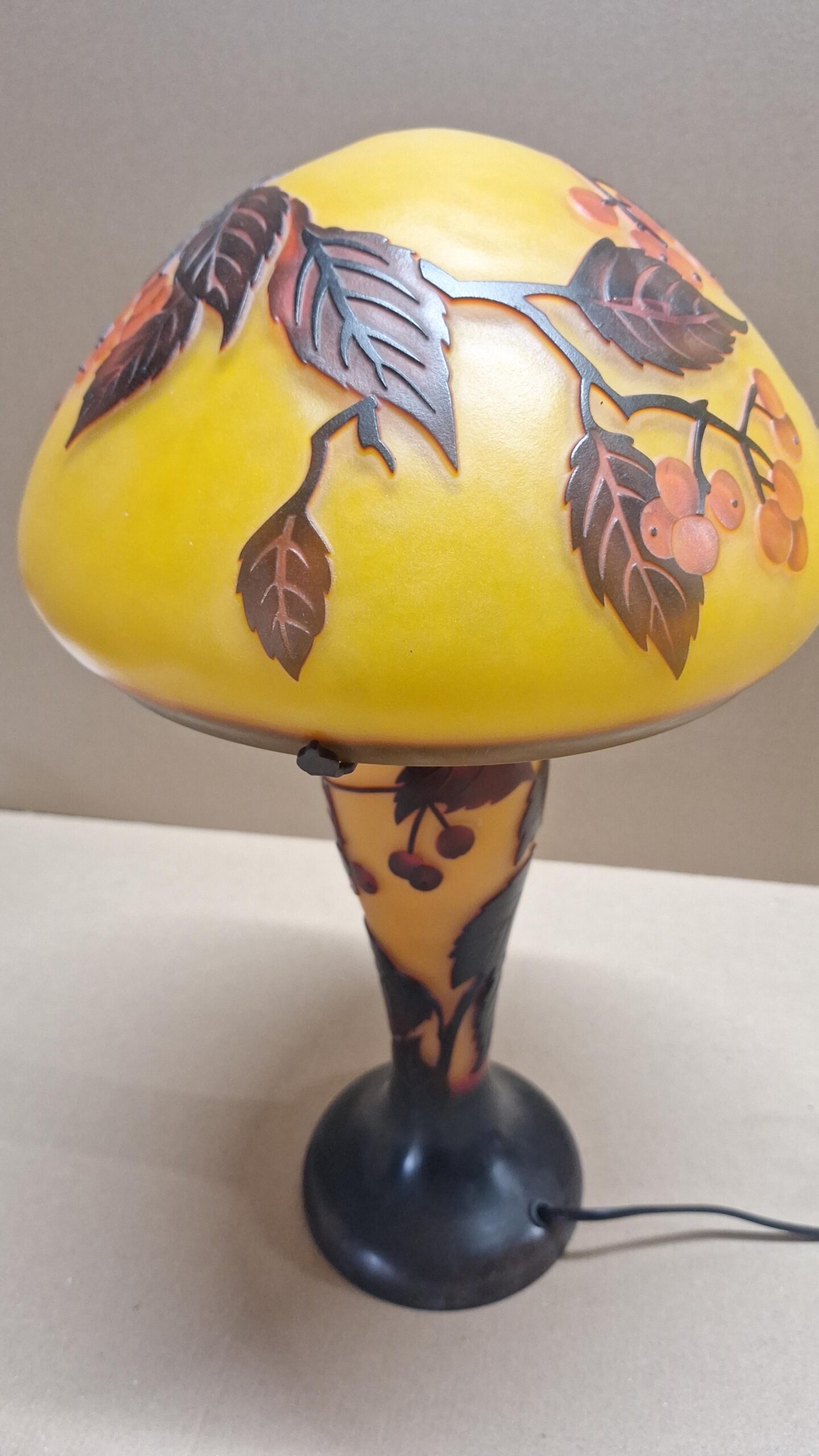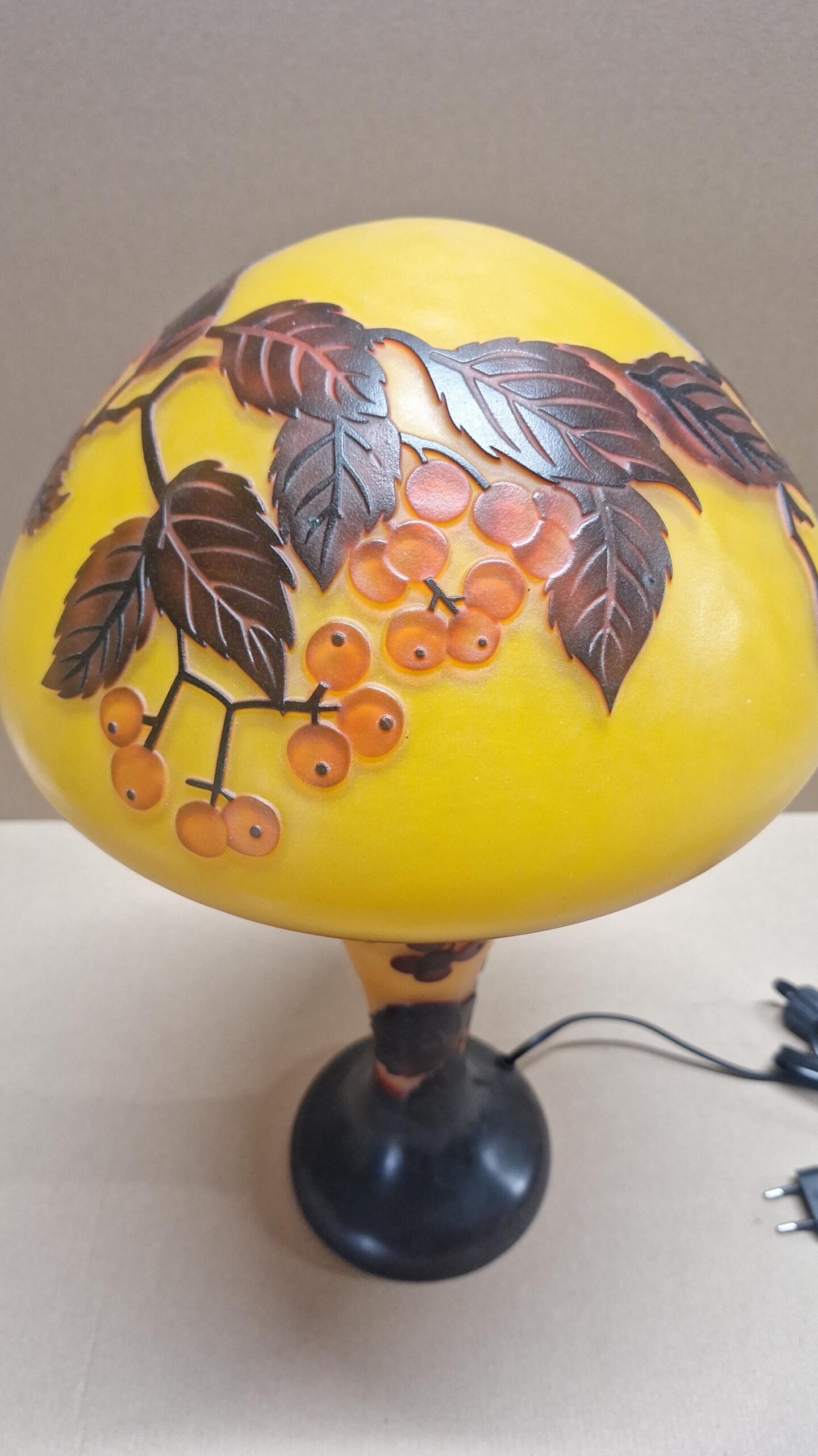 Wunderschöne gelb/braune große Lampe mit Beeren aus Glas in einer anmutigen Form, hergestellt nach der alten Cameo-Technik, nach dem Vorbild des weltberühmten Glaskünstlers Émile Gallé.