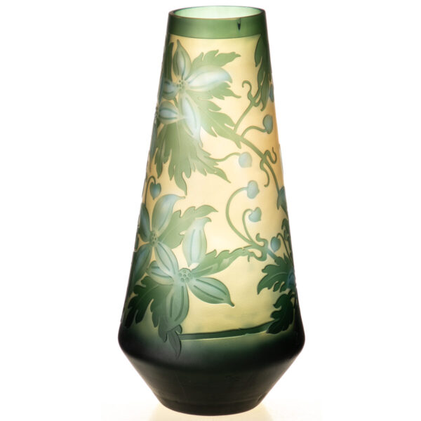 Bereichern Sie Ihre Einrichtung mit dieser beeindruckenden 44 cm hohen Cameo Glasvase, die mit stimmungsvollen Clematisblüten verziert ist. Die Vase hat eine elegante, spitz zulaufende Form und ist in natürlichen Grün- und Gelbtönen gehalten, die mit der authentischen Technik von Emile Gallé hergestellt wurden. Die Verwendung mehrerer Glasschichten sorgt für eine atemberaubende Tiefenwirkung und ein einzigartiges Lichtspiel, das diese handgefertigte Vase zu einem hochwertigen Kunstobjekt in Ihrem Zuhause macht.