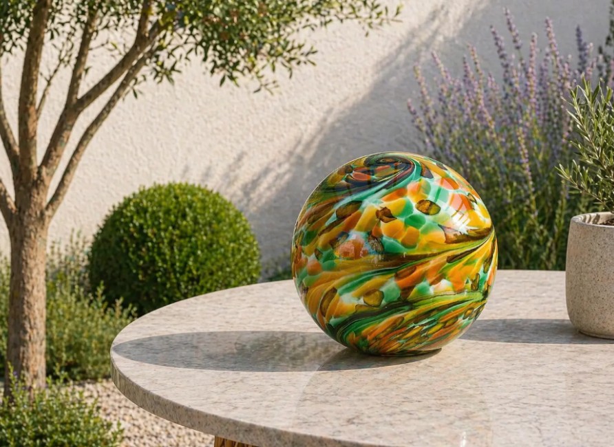 Deze opvallende decoratieve glasbol van 25 centimeter is een schitterende blikvanger voor jouw interieur of tuin. Het hoogwaardige glas is voorzien van een levendig, meerkleurig patroon waarin groene, oranje en gele tinten prachtig samenkomen en zorgen voor een uniek lichtspel. Een stijlvol en kleurrijk kunstwerk dat direct een artistieke sfeer toevoegt aan elke ruimte.