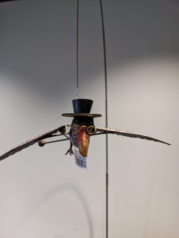 Eine fliegende weise Eule mit Hut und Brille hängt an diesem Gartenstab.