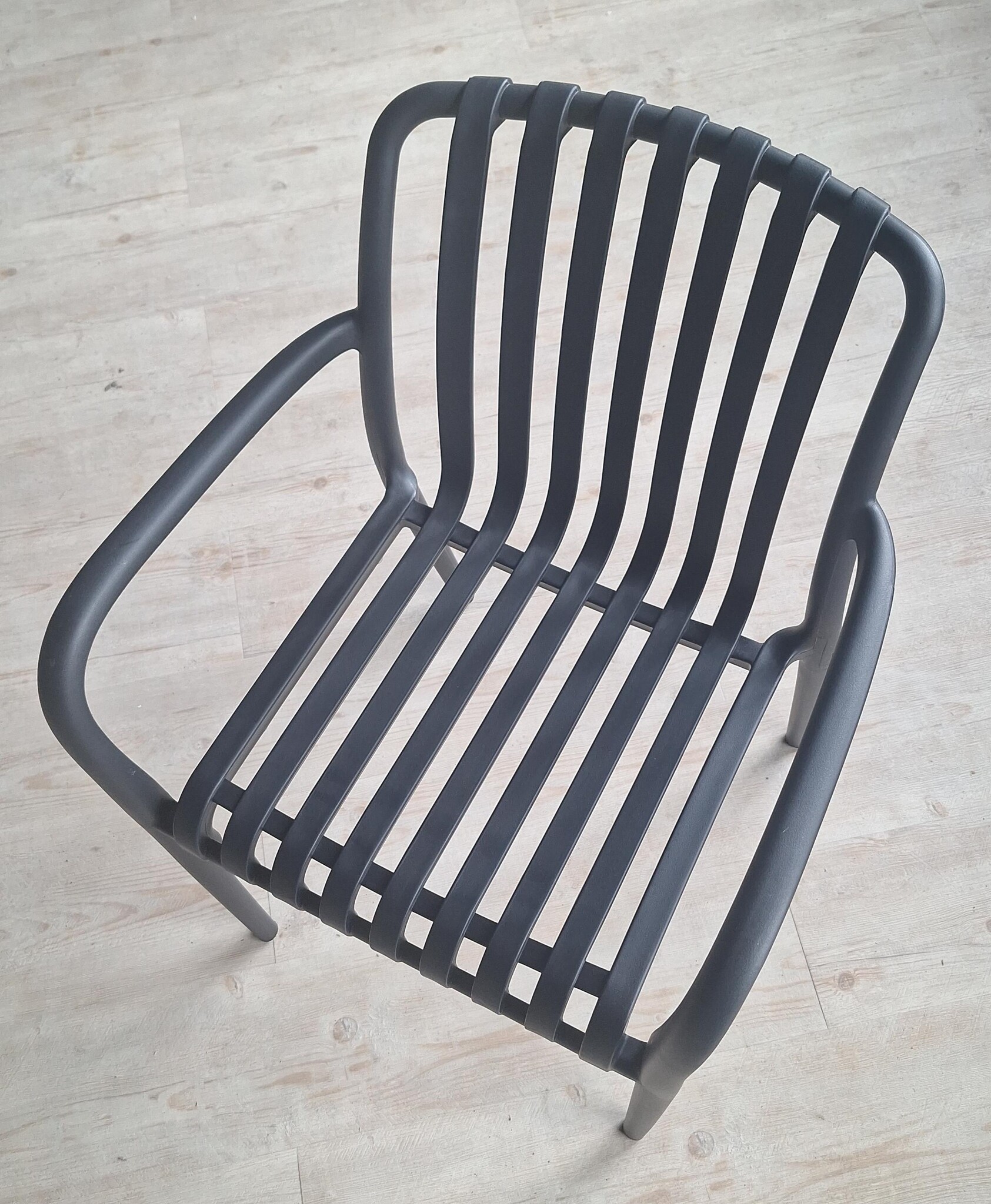 Schöner moderner Gartenstuhl, der in einem Stück aus dem strapazierfähigen Polypropylen hergestellt wird. Der Stuhl ist stapelbar und farbecht. Massiver Stuhl ohne hohle Beine. Da es sich um ein so schönes Modell mit einem ergänzenden Kissen handelt, kann dieser Stuhl auch im Innenbereich verwendet werden.