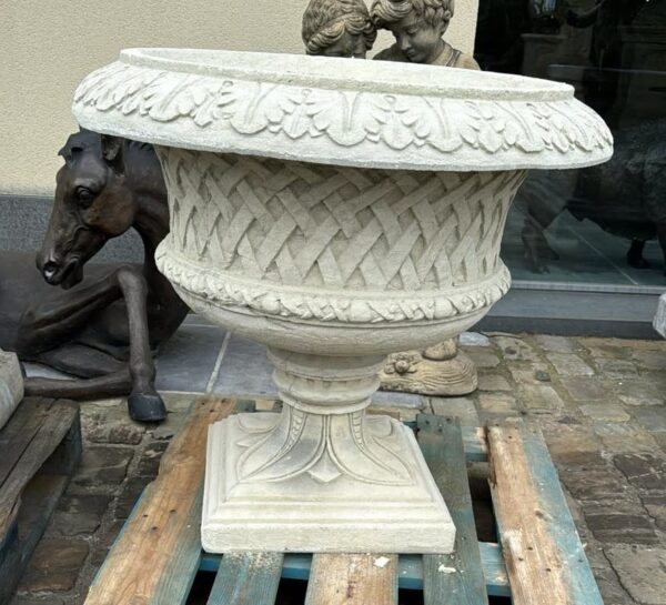 Mit dieser klassischen Gartenvase mit Korbrelief verleihen Sie Ihrem großen Garten, Ihrer Firma, Ihrem Park oder Ihrem Zuhause eine schöne und passende Atmosphäre.