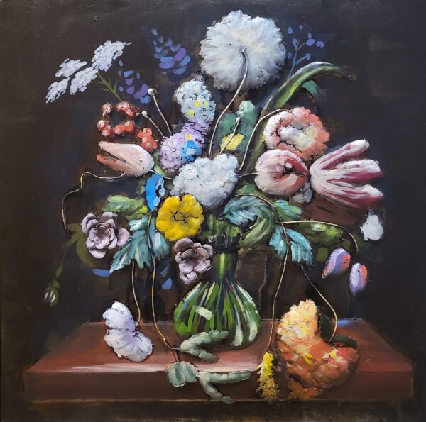 Mit dieser idyllischen Wanddekoration mit einem Blumenstrauß auf dunklem Hintergrund wird Ihr Zuhause wunderschön. Dieses 3D-Gemälde aus Metall wird vollständig von Hand gefertigt. Alles an dieser Wanddekoration ist aus Metall gefertigt, der Hintergrund und auch die Figur.