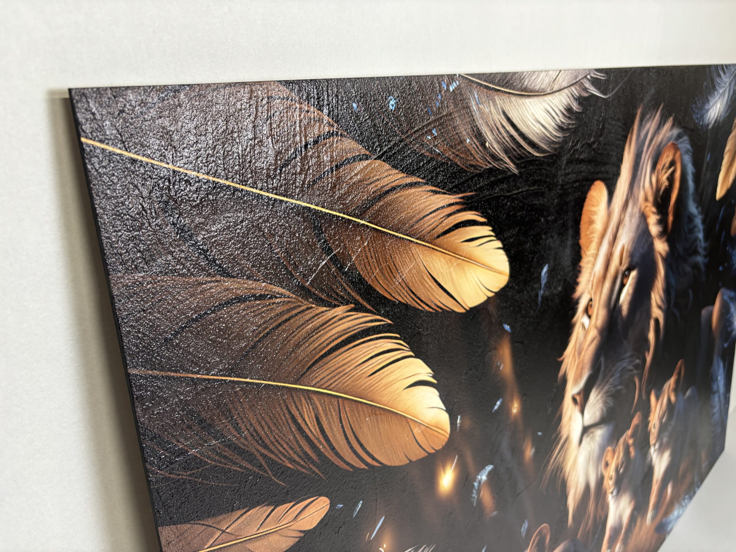 Sie möchten ein wunderschönes, scharfes Gemälde, das eine Löwenfamilie darstellt, finden aber Glas zu glänzend? Dann ist diese Serie von Bildern eine gute Alternative. Dieses Gemälde besteht aus einer strukturierten MDF-Platte, auf der dieses Bild gestochen scharf in einem wunderschönen Seidenglanz-Look abgebildet ist. Bei dieser Art von Gemälde werden Sie nicht unter Spiegelungen leiden. Auf der Rückseite ist dieses Gemälde mit einem 15 mm dicken MDF-Rahmen verstärkt.