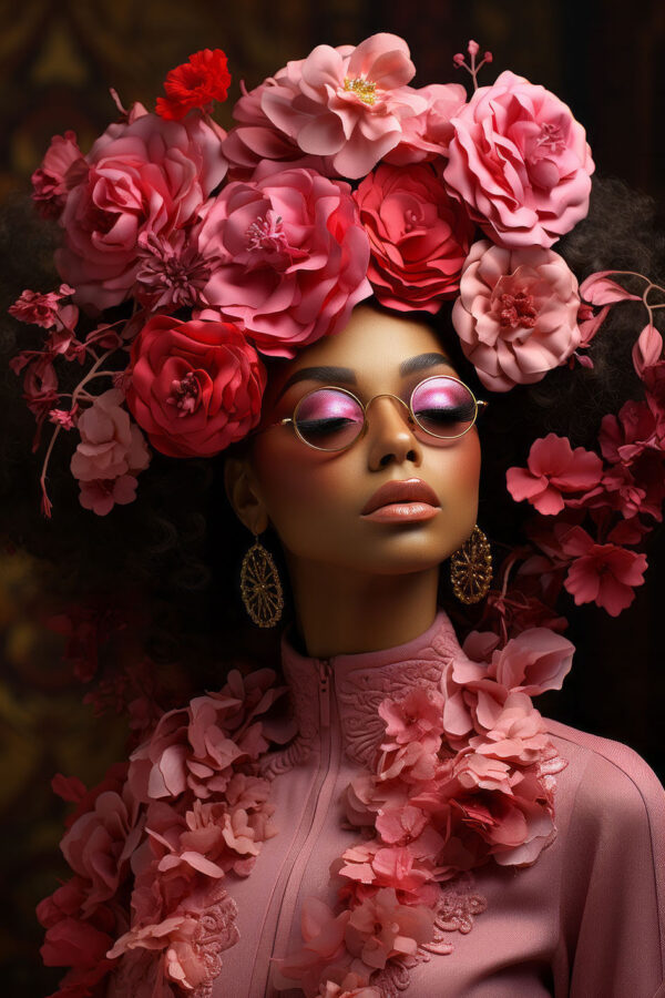 Dies ist eine hochwertige Glasplatte mit einer dunklen Frau in rosa Kleidung und Accessoires, in die viele 3D-Effekte eingearbeitet sind.
