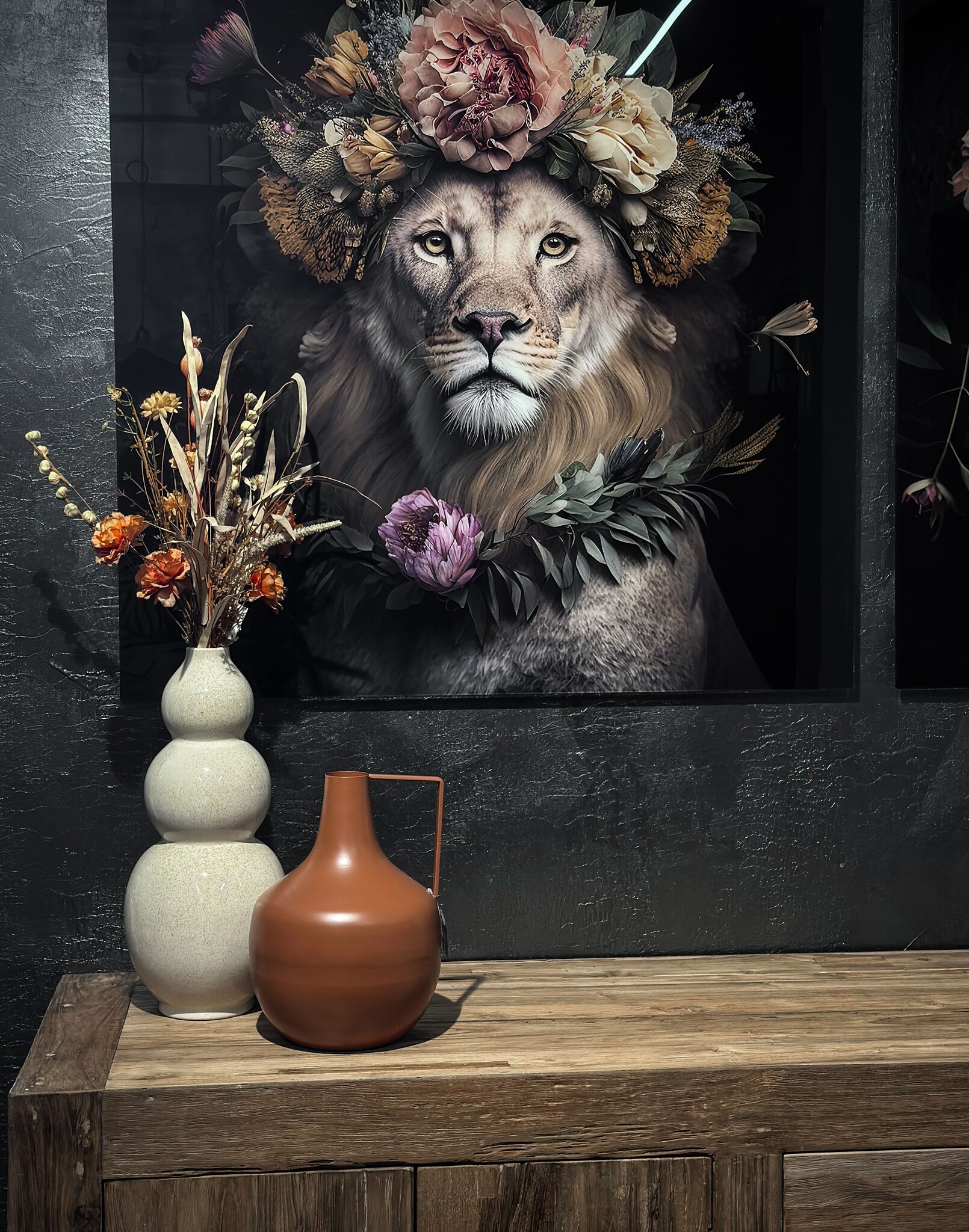 Glasgemälde Löwe mit Blumengirlande 100x100cm.
