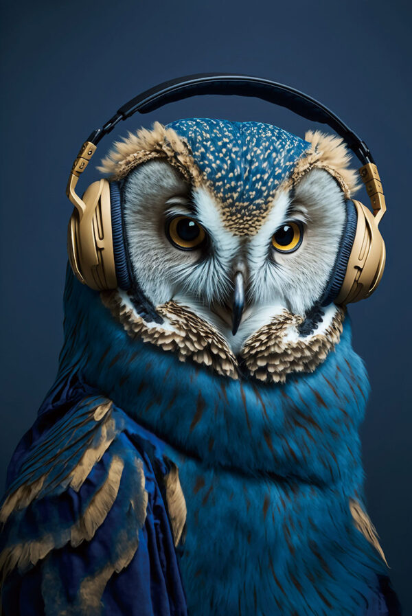 Dies ist ein hoher Glasteller mit einer modern gestalteten Eule mit goldenen Kopfhörern auf blauem Hintergrund.
