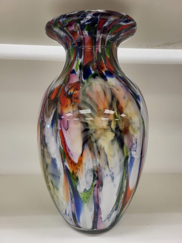 Diese farbige, dekorative Vase mit weißem Sockel wird mit der altmodischen, handwerklichen Technik der Glasbläserei hergestellt. Das Besondere ist, dass dieses schöne Modell einer Glasvase auf traditionelle Weise aus verschiedenen Glasfarben hergestellt wurde.