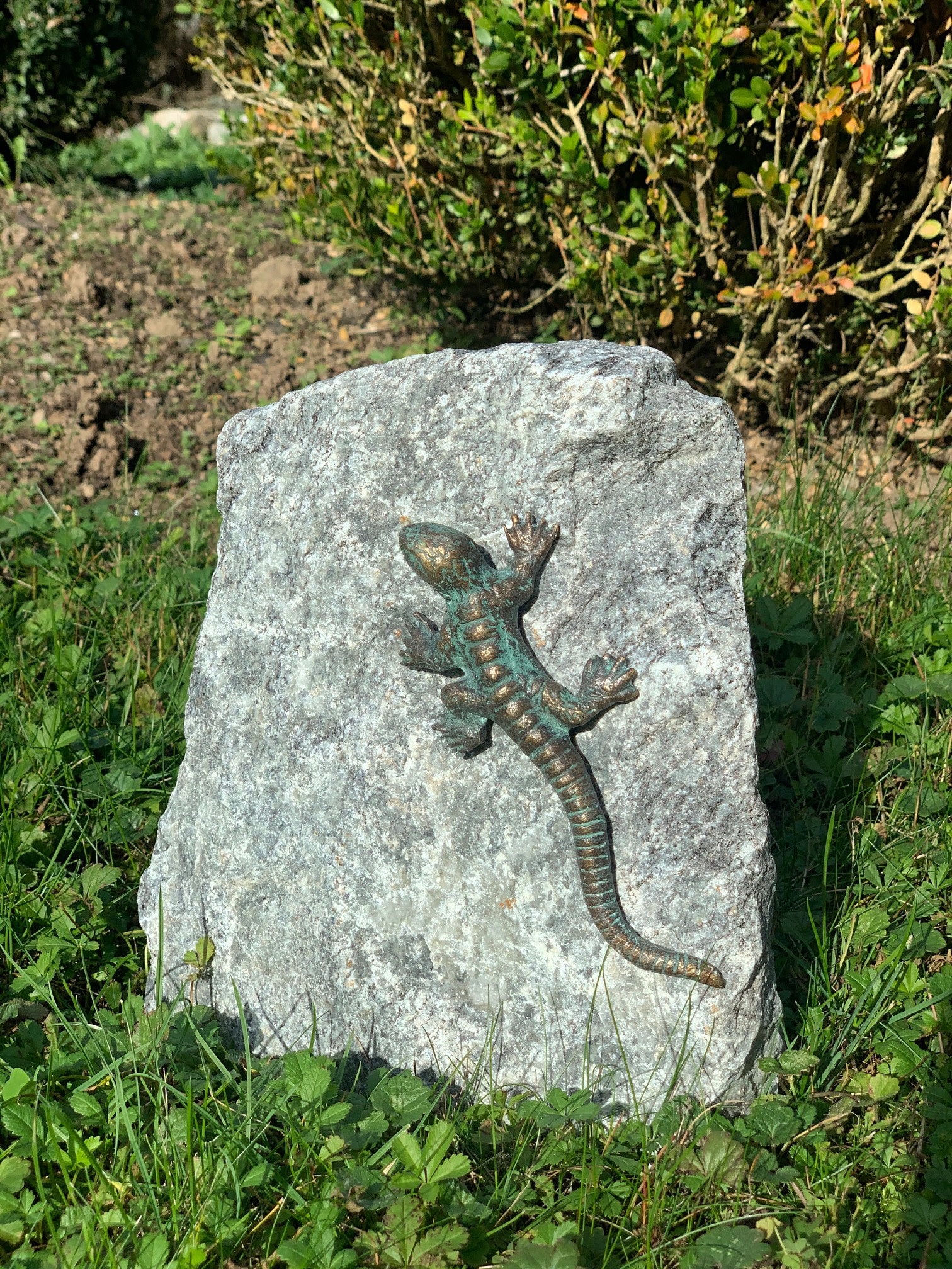 Wunderschöne Skulptur einer Eidechse aus hochwertiger Bronze, auf einem hohen Granitblock aus dem Schwarzwald. Diese Bronze ist von hoher europäischer Qualität, mit einem Mindestkupfergehalt von 75%, was eine sehr lange Lebensdauer gewährleistet. Da es sich um ein Naturprodukt handelt, weichen Form und Farbe immer vom Foto ab.