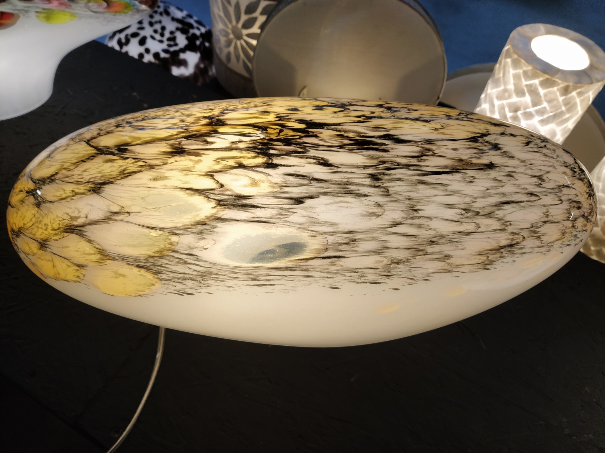 Setzen Sie mit der schönen Glaslampe ‚Marble‘ ein künstlerisches Statement in Ihrer Einrichtung. Dieses Modell mit einer Höhe von etwa 40-42 cm ist eine einzigartige Kreation der Marke Loranto. Die Lampe ist aus hochwertigem böhmischen Glas mundgeblasen, mit einem besonderen Marmoreffekt, der durch das Zusammenspiel verschiedener Farben, darunter Gelb und Weiß, entsteht. Wenn Sie die Beleuchtung einschalten, erzeugt sie ein warmes und lebendiges Lichtspiel im Raum.