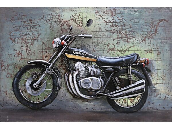 3-D-Gemälde eines Kawasaki-Motorrads, vollständig von Hand aus Eisen gefertigt, einschließlich des Hintergrunds.