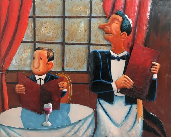 Metallgemälde, das ein Restaurant darstellt und aus einzelnen Metallstücken besteht, die für einen optimalen 3D-Effekt von Hand zusammengeschweißt wurden. Ein schönes Stück Wanddekoration für Ihr Zuhause, draußen unter einem Vordach oder in Ihrem Geschäft. Die Farben und das allgemeine Erscheinungsbild können vom Foto abweichen, da der gesamte Artikel von Menschenhand gefertigt wurde.