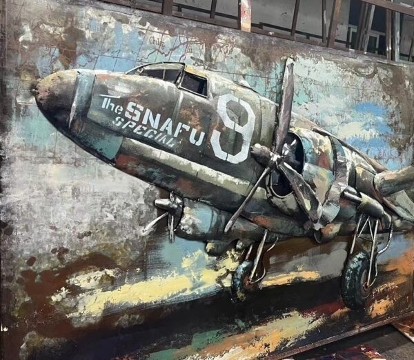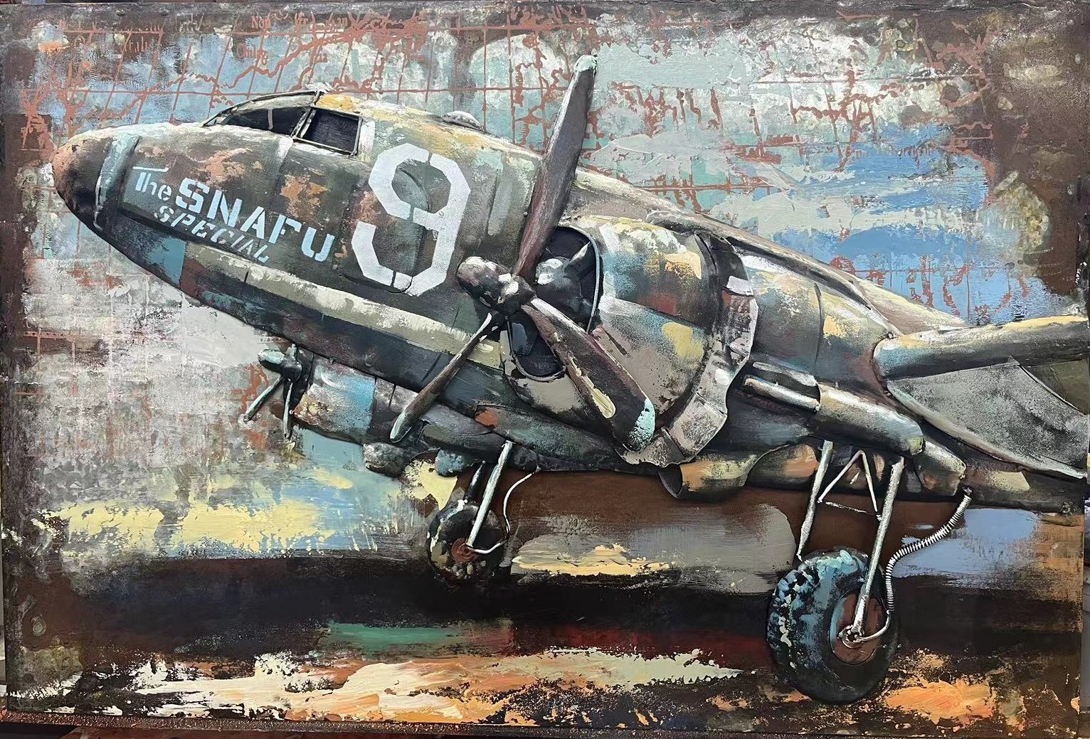 Ein wunderschönes 3D-Metallbild, das ein in kühler Atmosphäre abhebendes Flugzeug darstellt. Es wurde aus einzelnen Metallstücken gefertigt, die alle von Hand zusammengeschweißt wurden, um den bestmöglichen 3D-Effekt zu erzielen. Ein schönes Stück Wanddekoration für Ihr Zuhause, draußen unter einem Vordach oder in Ihrem Geschäft. Die Farben und das allgemeine Erscheinungsbild können vom Foto abweichen, da der gesamte Artikel von Menschenhand gefertigt wurde.