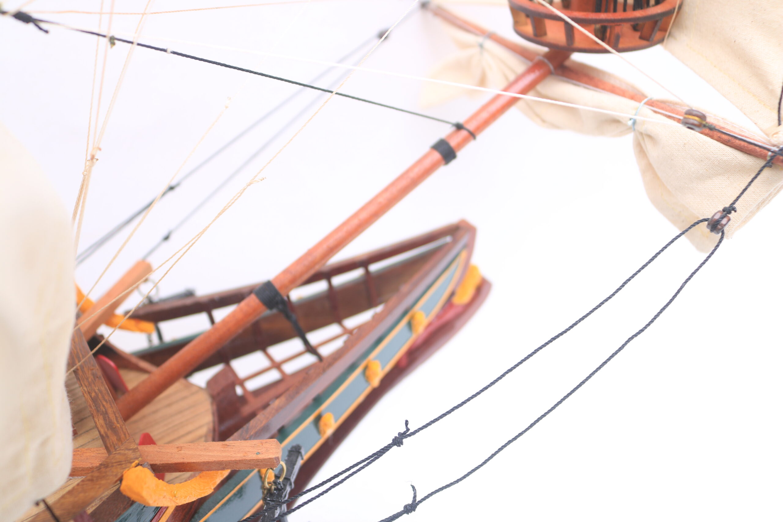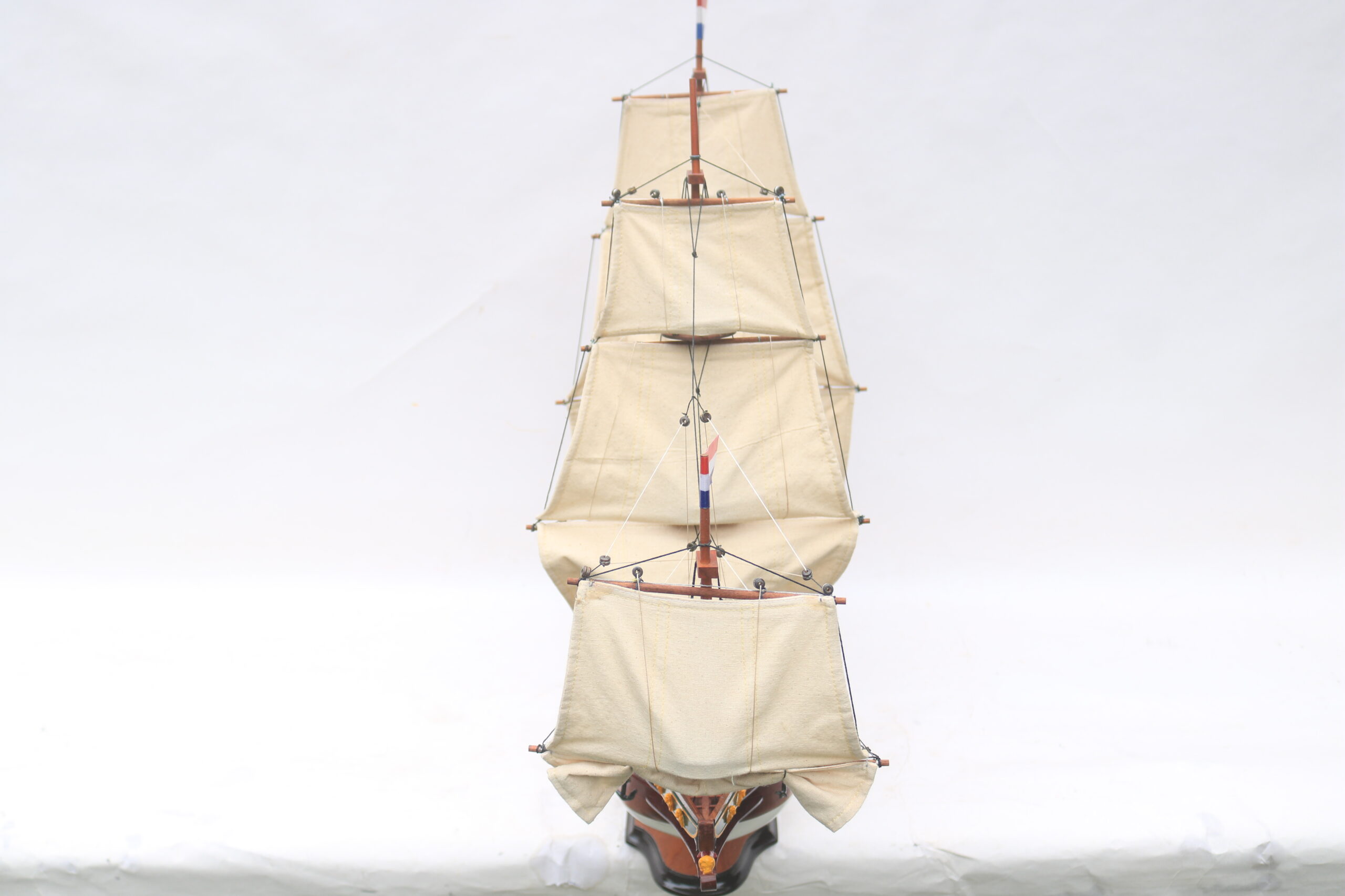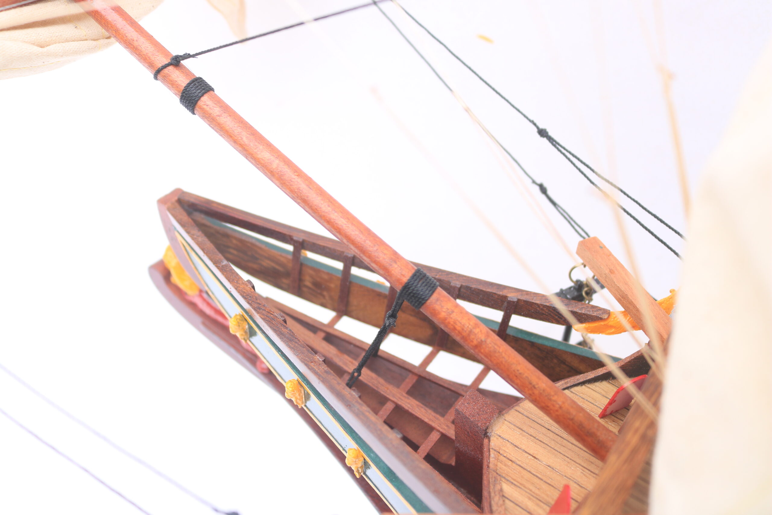 Sie erhalten eine Kiste mit diesem Holzboot. Nach Erhalt müssen Sie den Mast aufstellen und dann sorgfältig die entsprechenden Leinen und Leinensegel gemäß der mitgelieferten Zeichnung spannen.