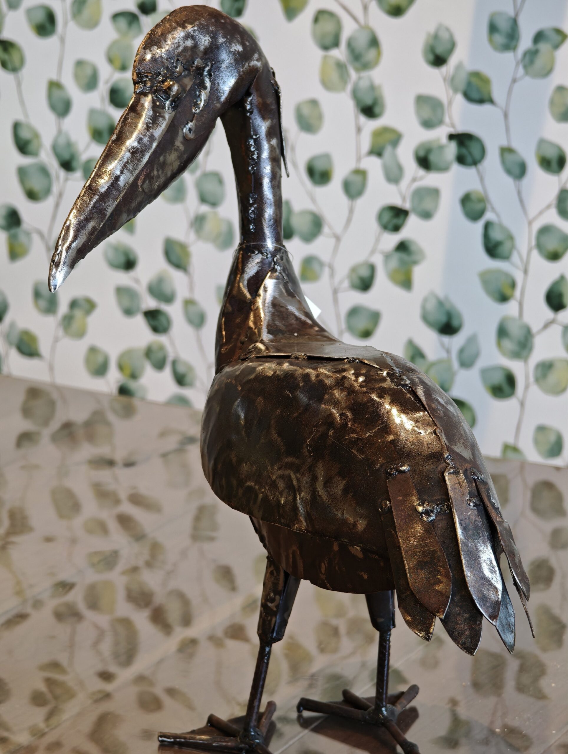 Fügen Sie Ihrem Garten oder Ihrem Interieur mit diesem einzigartigen Pelikan aus Metall ein robustes und langlebiges Element hinzu. Mit einer Höhe von 44 cm ist diese mittelgroße Skulptur ein schöner Blickfang, der sofort die Geschichte ihrer Herkunft erzählt. Die Skulptur ist nämlich aus recycelten Ölfässern gefertigt und verleiht altem Material ein brillantes zweites Leben als Kunstobjekt.