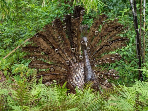 Übergroße Gartenstatue, die einen Pfau mit gespreiztem Schwanz zeigt, aus Metall gefertigt 160cm