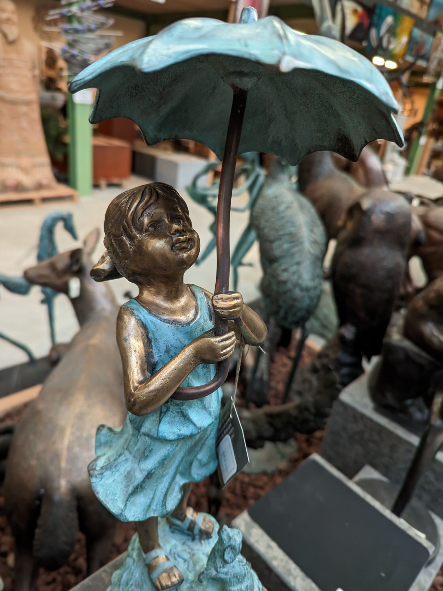 Wunderschöne Statue eines Mädchens unter einem Regenschirm mit abfließendem Wasser, hergestellt aus hochwertiger Bronze mit einem Kupfergehalt von mindestens 75 %, was eine sehr lange Lebensdauer garantiert.