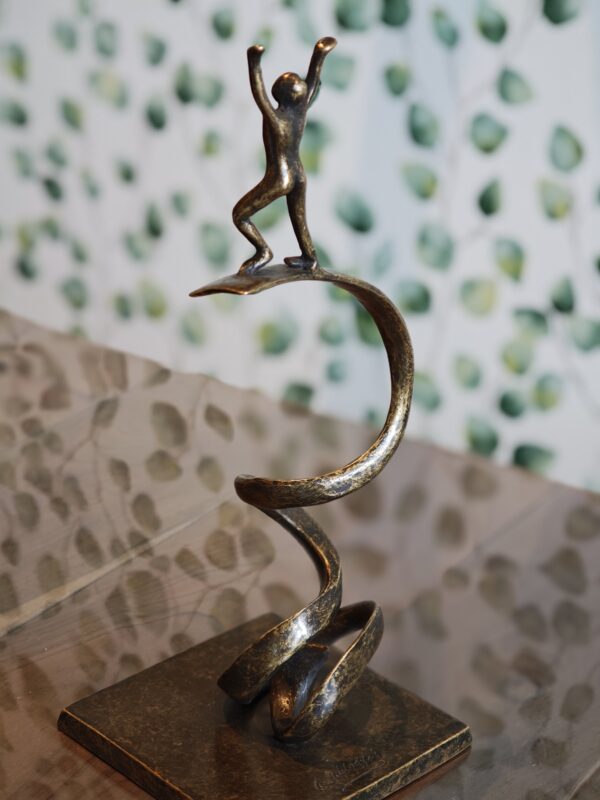 Diese inspirierende Bronzestatue, 34 cm hoch, zeigt eine Figur, die triumphierend auf einer Spirale steht. Sie symbolisiert das Erreichen des Gipfels und das Feiern des Erfolgs. Die Skulptur ist aus hochwertiger Bronze mit einem Kupferanteil von mindestens 75% gegossen und wird mit einem Zertifikat geliefert. Ein ideales Geschenk für besondere Auftritte, das Sie neben vielen anderen Modellen auch physisch in unserem Showroom in Ammerzoden bewundern können.
