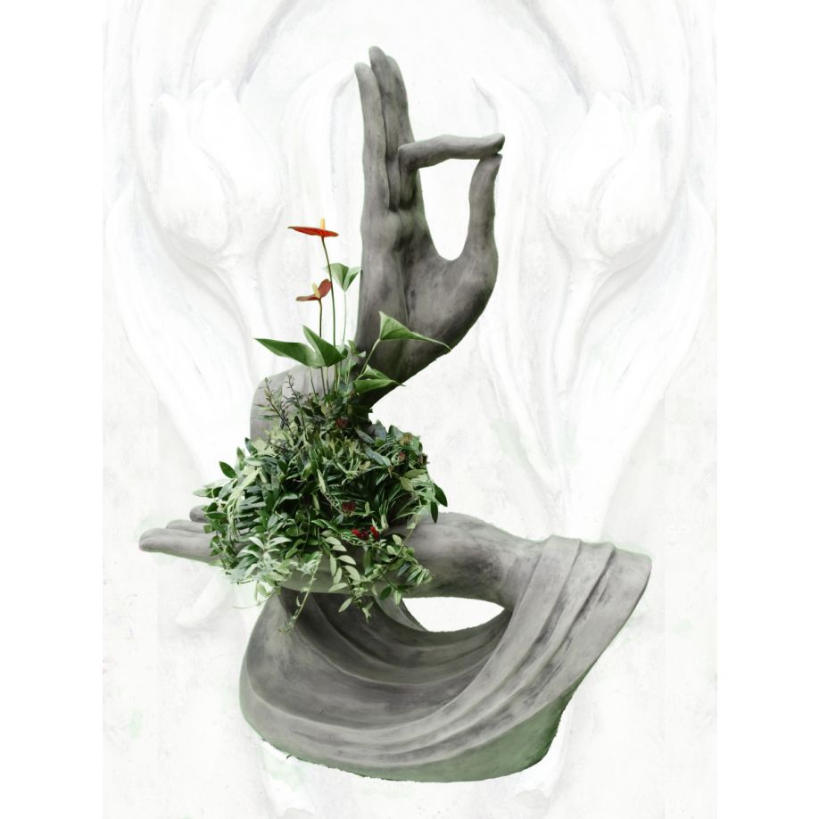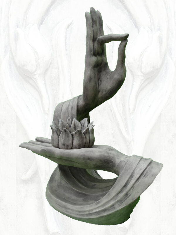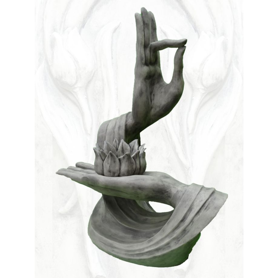 Diese 128 cm hohe (200 kg schwere) Skulptur aus massivem Steinguss zeigt detaillierte Yoga-Hände in grauem Finish. Die Statue steht auf einer stabilen Bodenplatte und trägt das Original Vidroflor-Gütesiegel als Qualitätsgarantie. Dank seines wetterfesten Materials ist dieses Objekt sowohl für den Innen- als auch für den Außenbereich geeignet.