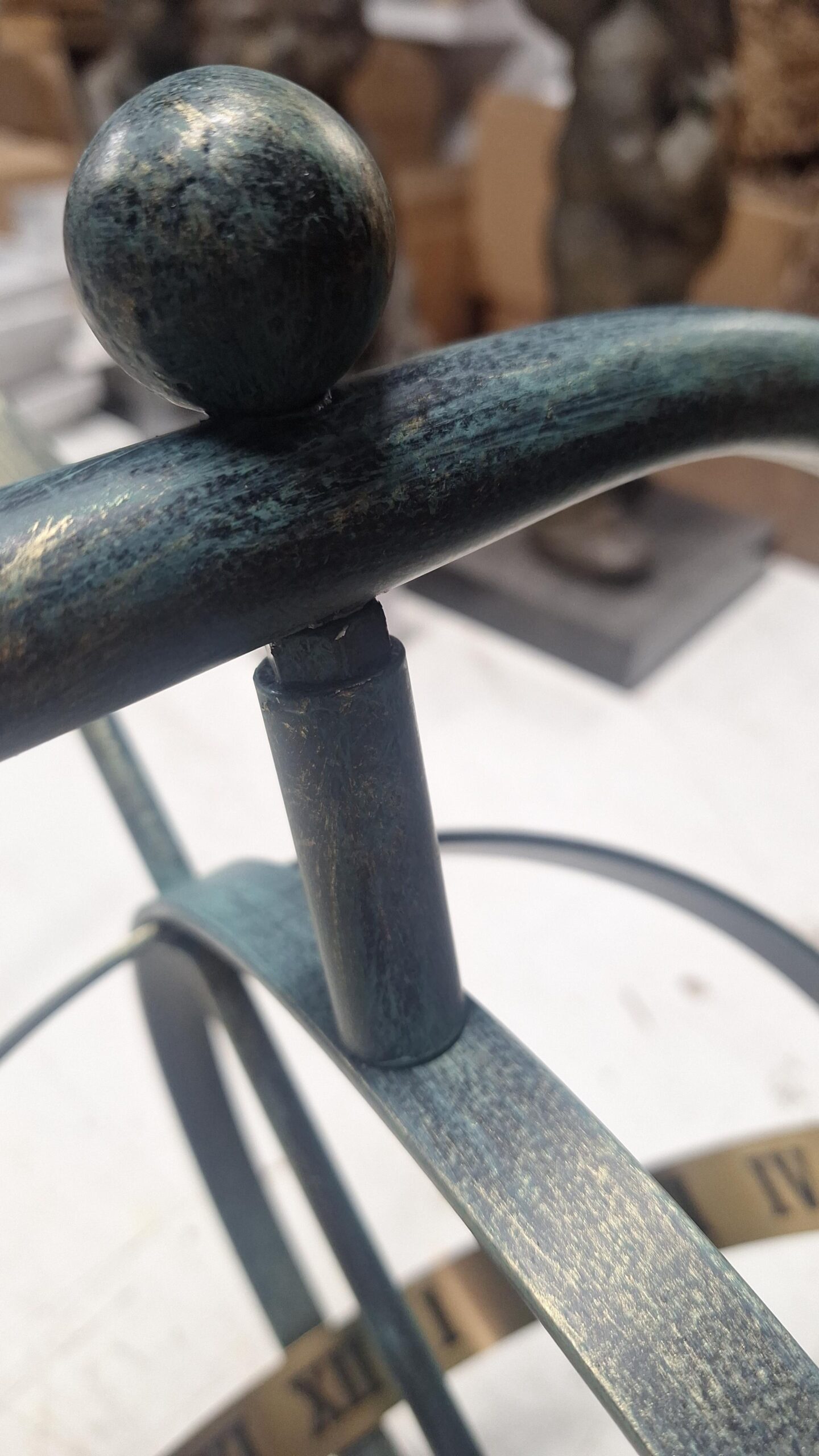 Verschönern Sie Ihren Garten mit einer Sonnenuhr aus Metall auf einem 155 cm hohen Pfahl. Der authentische Look dieser Sonnenuhr ist eine wahre Augenweide, wenn Sie die anmutige Atmosphäre von Sonnenuhren aus dickem Metall lieben. Diese Sonnenuhr aus massivem Eisen hat eine schöne altgrüne Farbe und einen klassischen Look.