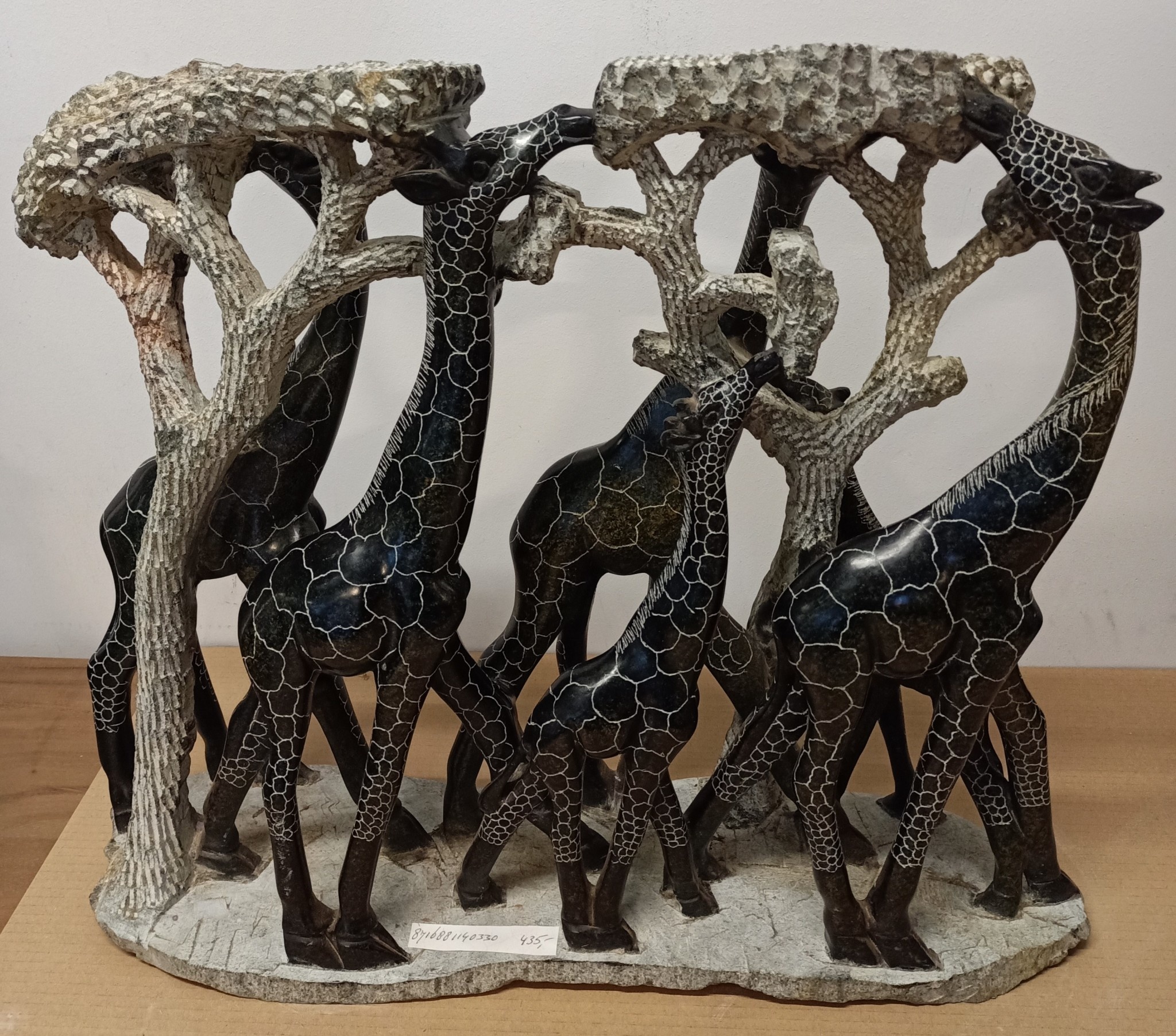 Diese Modellskulptur, die eine afrikanische Giraffenherde unter Bäumen darstellt, kann in Farbe und Form vom Foto abweichen, da sie handgefertigt ist und zudem aus einem natürlichen Material besteht.