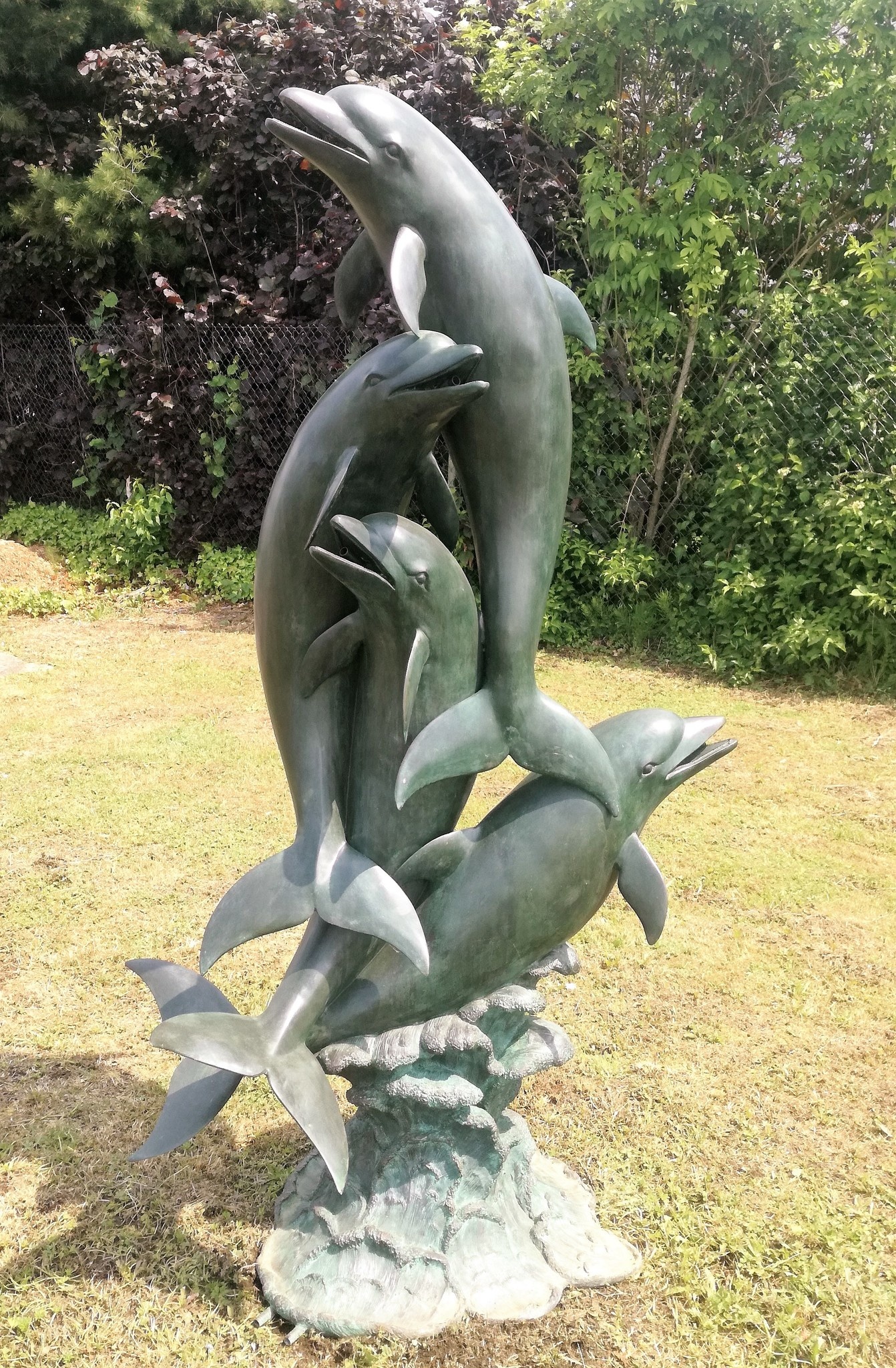 Wunderschöne Statue/Brunnen mit vier großen spritzenden Delphinen aus hochwertiger Bronze mit einem Mindestkupfergehalt von 75%, was eine sehr lange Lebensdauer garantiert.