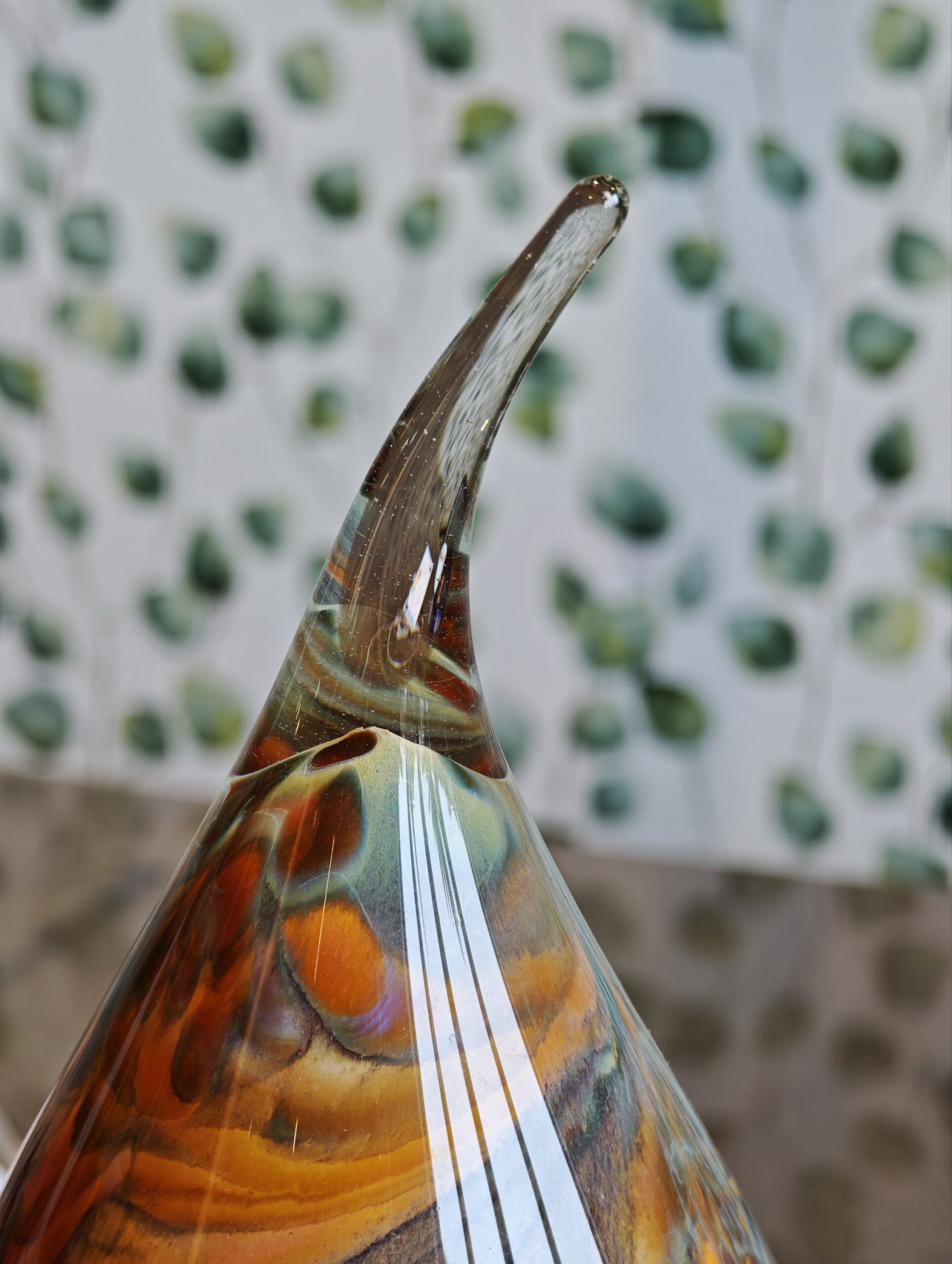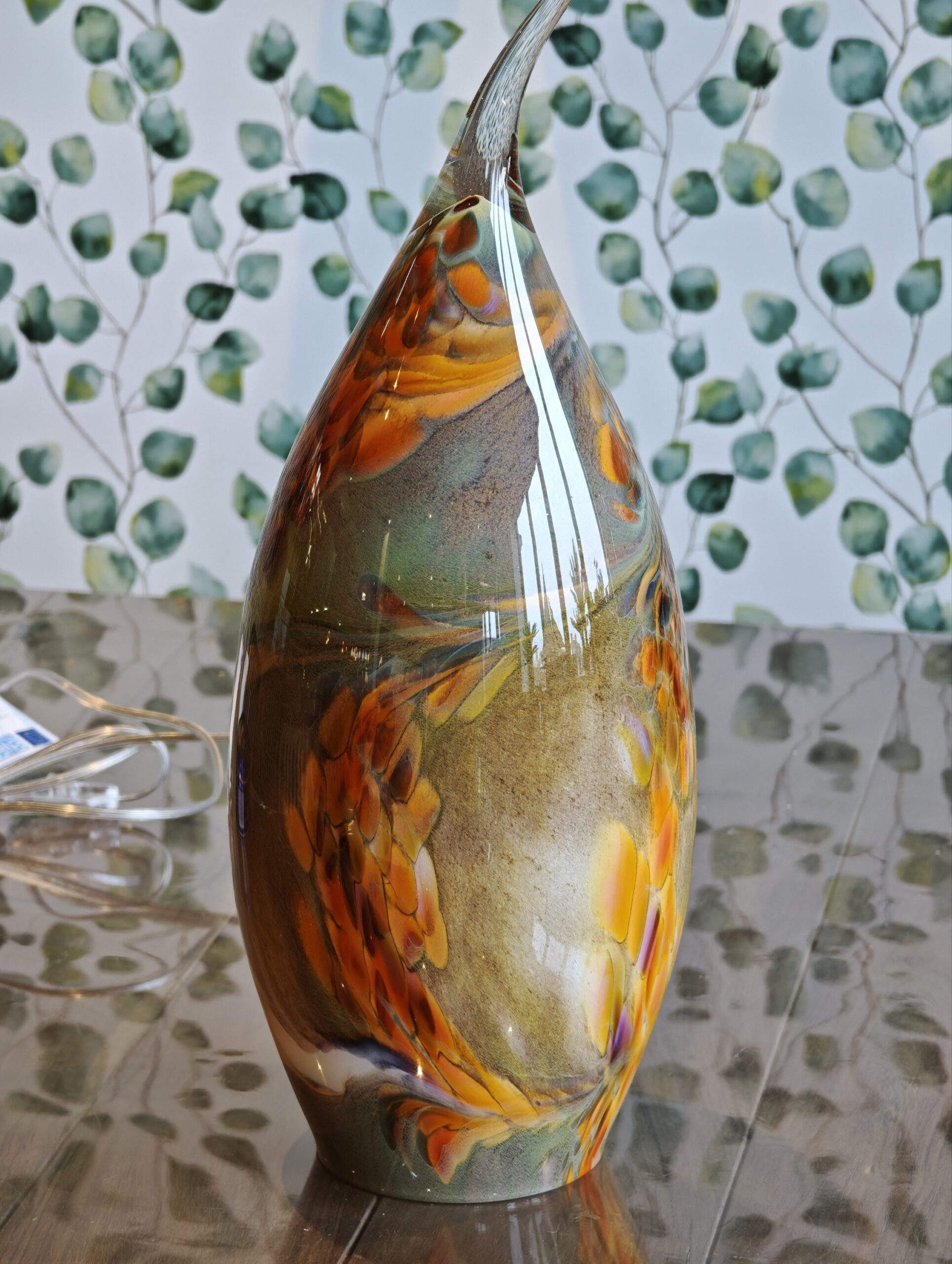 Diese 45 cm hohe, elegante Glaslampe hat eine einzigartige, konische Form und ist in warmen Terra- und Brauntönen gehalten. Es ist ein attraktives, handgefertigtes Objekt mit organischen Mustern, die jedes Exemplar zu einem Unikat machen und Ihrer Einrichtung einen warmen und exklusiven Look verleihen.