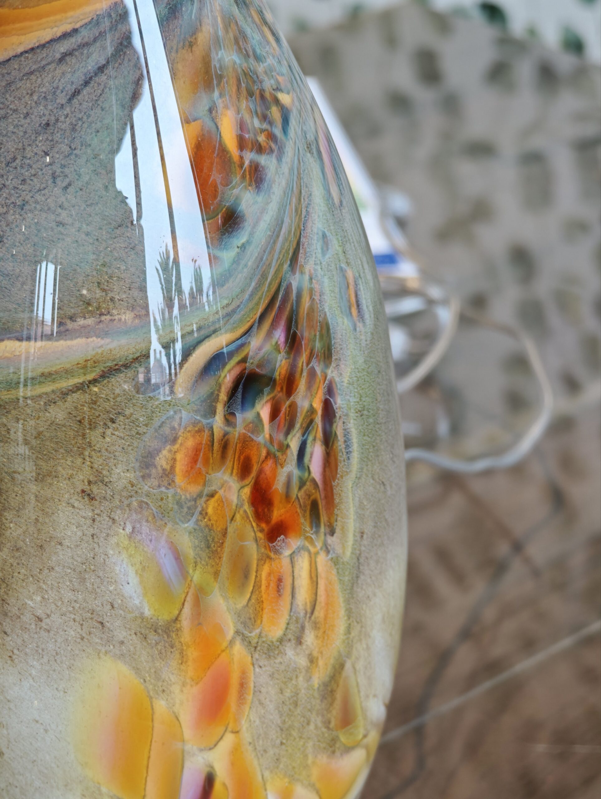 Bringen Sie einen warmen, erdigen Glanz in Ihr Interieur mit diesem beeindruckenden Lampenglas Casper Terra Flores. Mit einer Höhe von 45 cm und einer eleganten, organischen Tropfenform ist diese Lampe ein Statement für sich. Das Glas ist mit einer reichen Palette von Terra-, Braun- und Ockertönen durchzogen, die in einem dynamischen Wechselspiel durch das Material fließen. Einmal angezündet, verwandelt sich dieses Linienspiel in ein stimmungsvolles Lichtobjekt, das sofort Gemütlichkeit in Ihr Wohn- oder Schlafzimmer bringt.