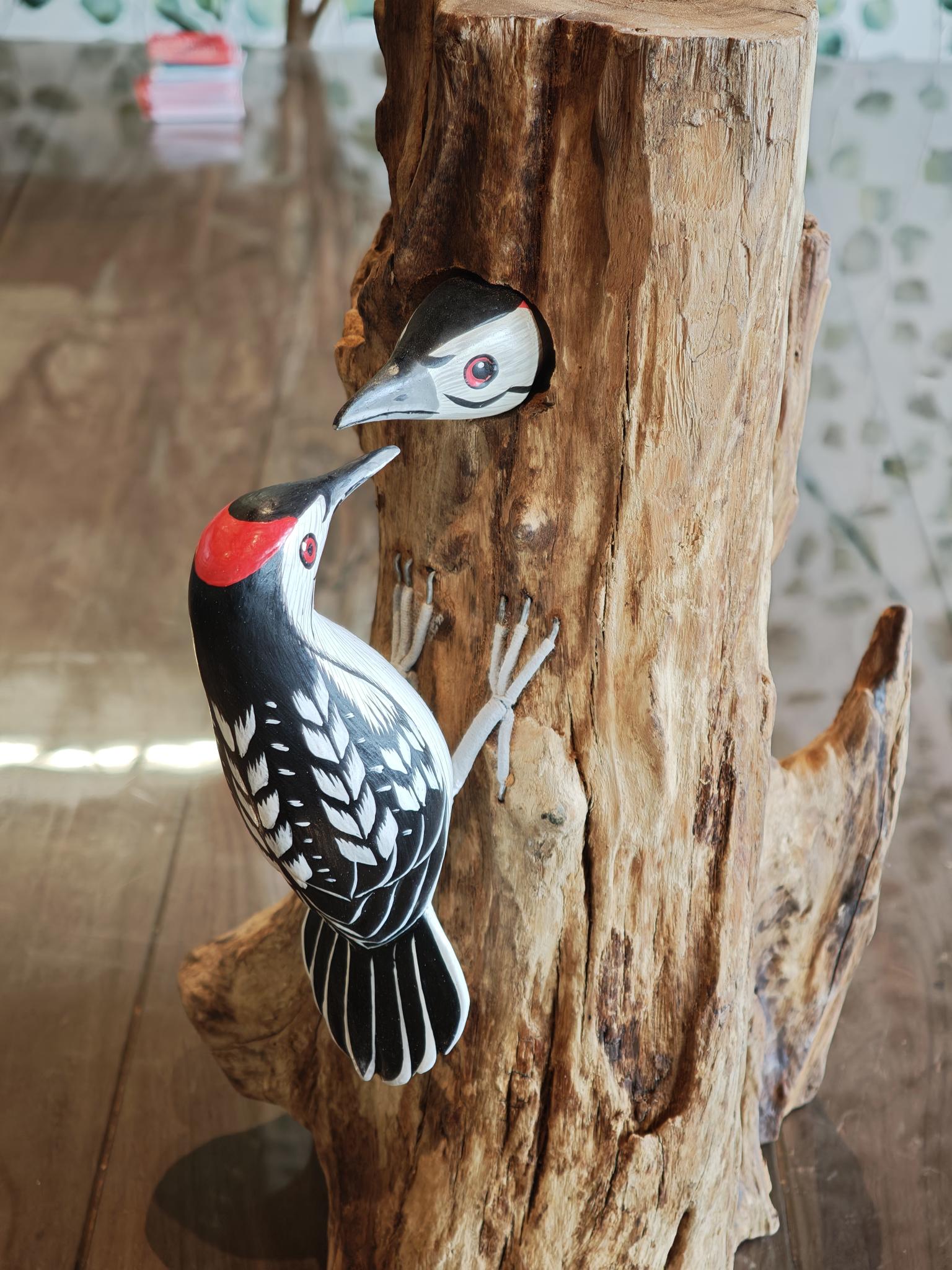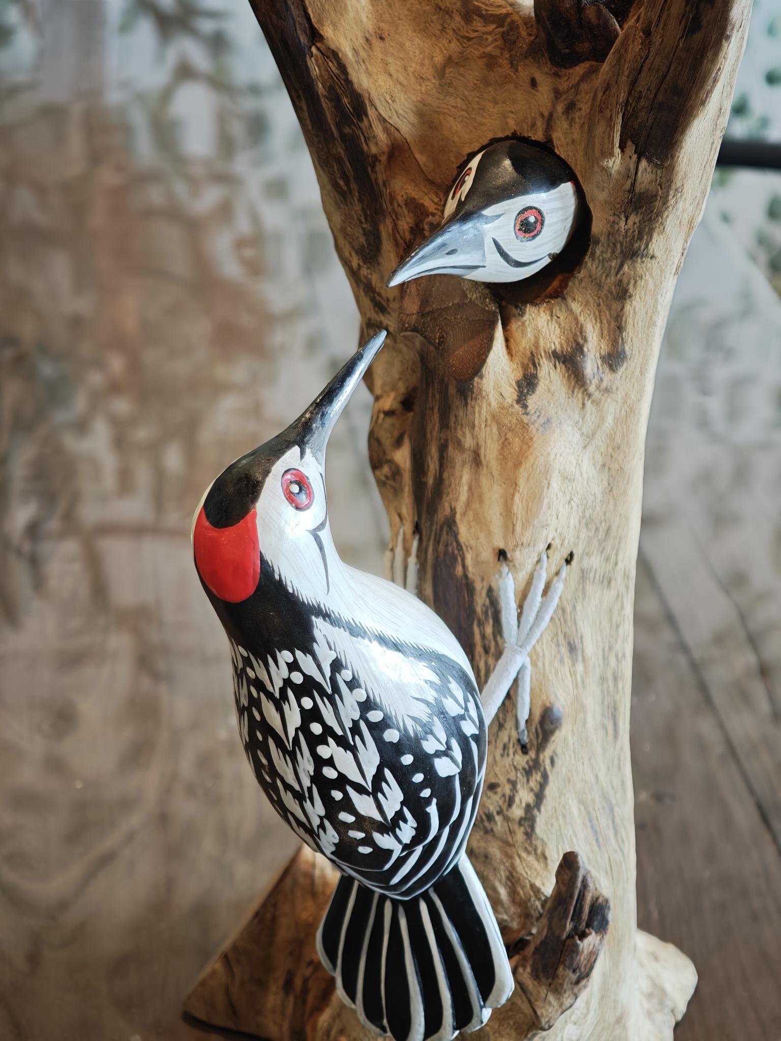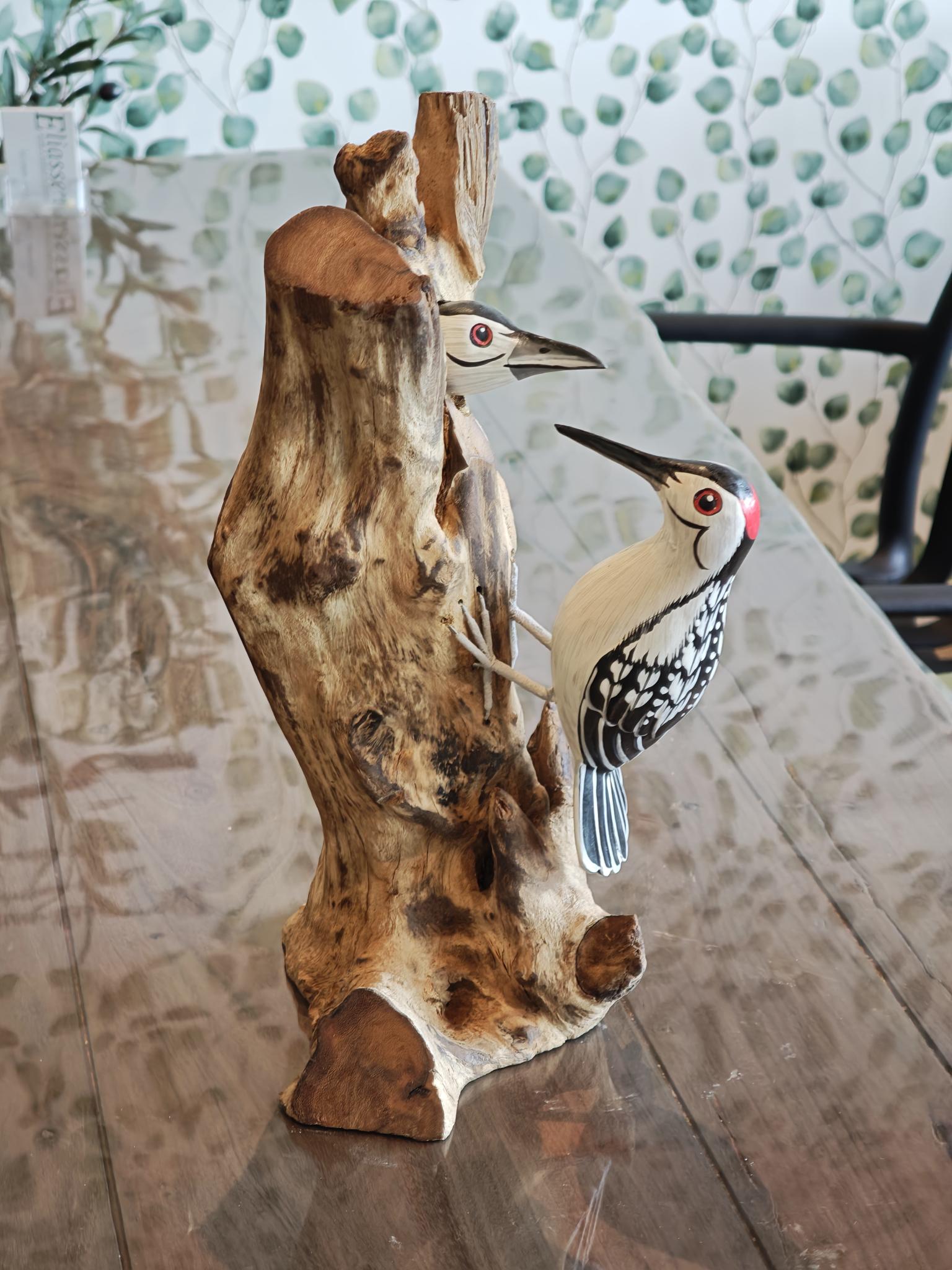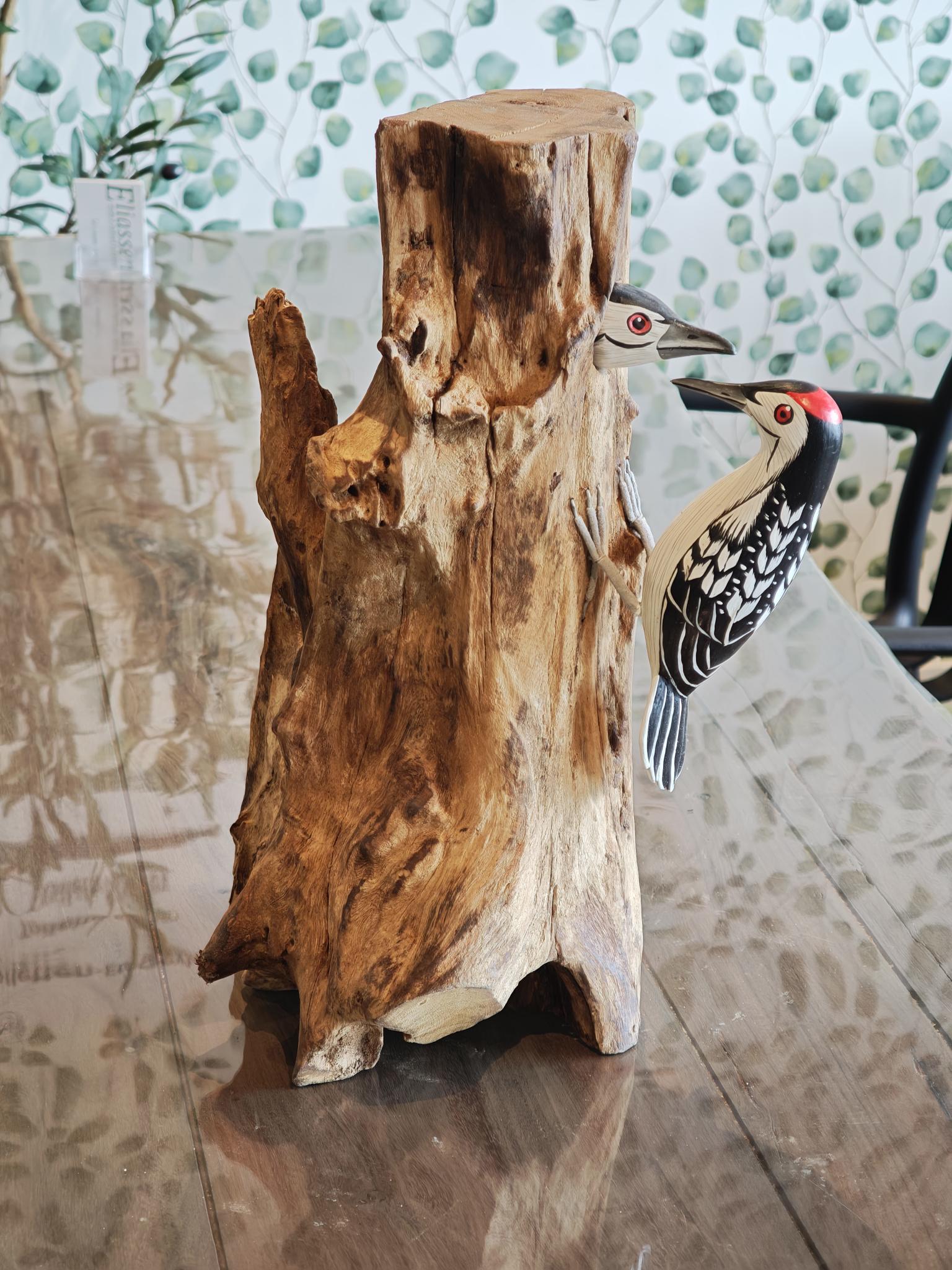 Ein wunderschönes Stück Handwerkskunst, dieses Spechtpaar auf einem Stück Rohholz, handgefertigt aus massivem Suarholz.