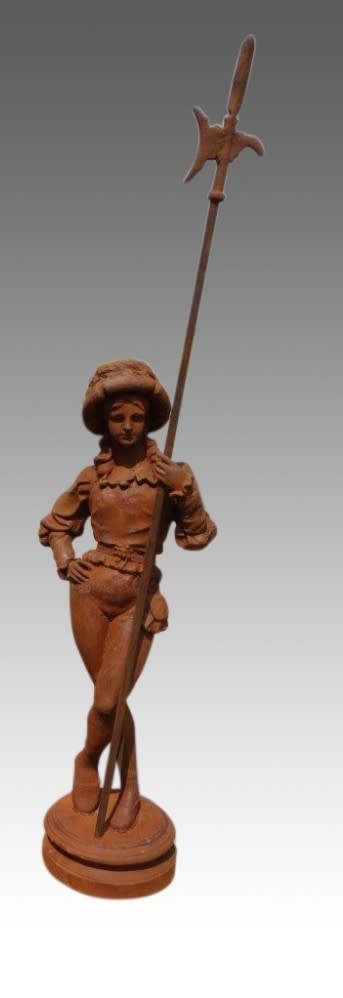 Sie suchen nach einer nostalgischen Skulptur im zeitlosen Landhausstil, die nie kaputt geht? Dann könnte diese gusseiserne Statue in Form einer mittelalterlichen Wächterlanze auf der linken Seite etwas für Sie sein.
