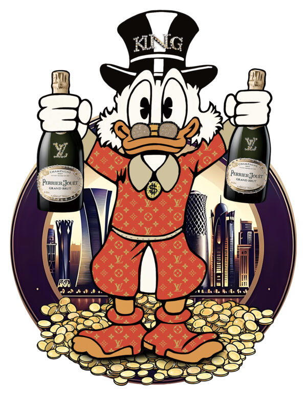 Dieses Gemälde zeigt die weltberühmte Ente in einer triumphalen Pose. Dagobert trägt einen auffälligen roten Hausanzug mit einem luxuriösen Designermuster, das an Louis Vuitton erinnert. In seinen Händen hält er zwei Flaschen Perrier Jouët Champagner, bereit, das Leben zu feiern. Er steht auf einem riesigen Haufen von Goldmünzen, mit der Skyline einer modernen Metropole im Hintergrund.