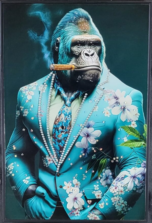 Sind Sie auf der Suche nach einem hypermodernen Leinwandbild mit verschiedenen Strass-Akzenten? Dann ist dieses Modellgemälde, das einen schick gekleideten Gorilla-Affen zeigt, genau das Richtige für Sie. Dieses große Leinwandgemälde hat sehr schöne Akzente mit Strasssteinen auf dem Anzug und dem Kopf des Affen. Es wurde sorgfältig mit den feinsten Farbkompositionen und mit großer Aufmerksamkeit für den letzten Schliff gefertigt!