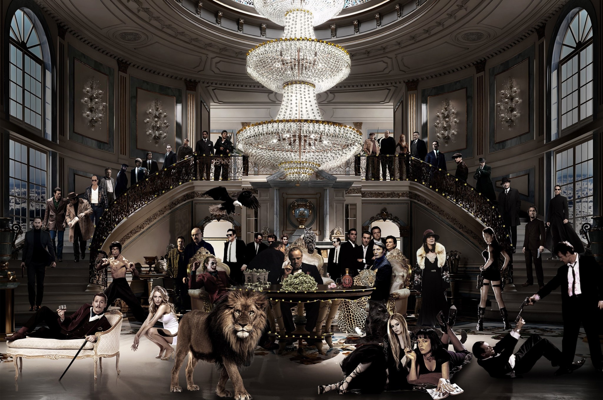 Sind Sie auf der Suche nach einem hypermodernen Glasgemälde mit verschiedenen Strassstein-Akzenten? Dann ist dieses Modell-Glasgemälde, das eine Reihe von Prominenten in einem großen Flur zeigt, genau das Richtige für Sie. Dieses breite Glasgemälde hat sehr schöne Steinakzente auf der Treppe, dem Tisch und dem Kronleuchter. Es wurde sorgfältig mit den schönsten Farbkompositionen und mit großer Aufmerksamkeit für den letzten Schliff gefertigt!