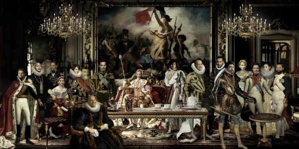 Sind Sie auf der Suche nach einem hypermodernen Glasgemälde mit verschiedenen Strassstein-Akzenten? Dann ist dieses Modell-Glasgemälde mit einer Vielzahl von Prominenten in königlichen Gewändern genau das Richtige für Sie. Dieses breite Glasgemälde hat sehr schöne Steinakzente an den Kleidern und den beiden Kronleuchtern. Es wurde sorgfältig mit den feinsten Farbkompositionen und mit großer Aufmerksamkeit für den letzten Schliff gefertigt!