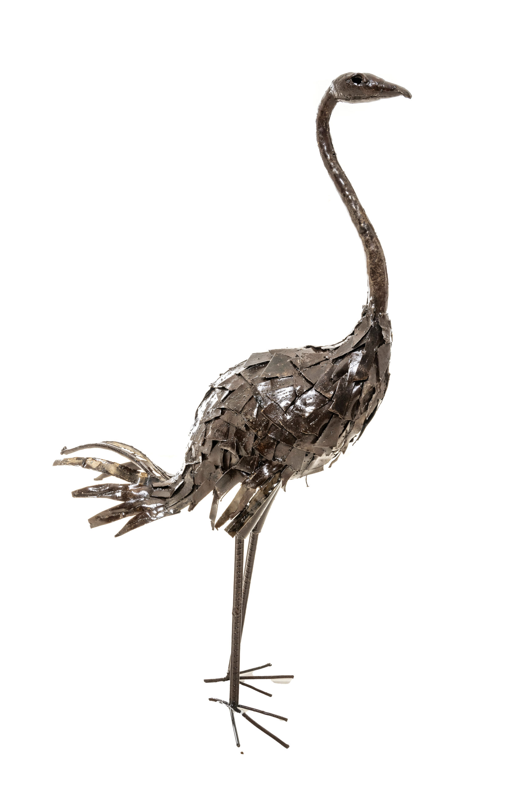 Dieser robuste 90 cm lange Strauß aus Metall ist ein einzigartiges Fairtrade-Kunstwerk, das aus recycelten Ölfässern handgefertigt wurde. Die Skulptur besticht durch ihr industrielles Design, bei dem Schichten aus Metall zu einer kunstvollen Federhülle und einem anmutigen langen Hals verarbeitet wurden. Ein robustes und langlebiges Designerstück mit dunkler, glänzender Oberfläche, das jedem Garten oder Wohnbereich Charakter verleiht.