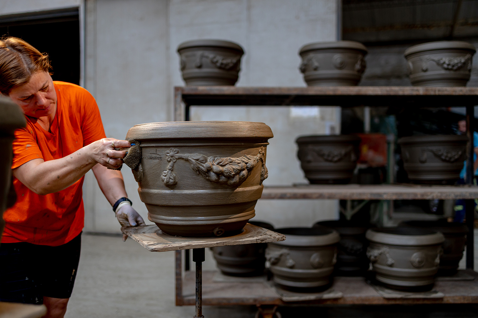 Dieser dicke und robuste, handgedrehte Terrakotta-Topf hat ein vertrautes, klassisches Aussehen. Der Mittelmeerraum bestimmt das Aussehen dieses runden Topfes. Diese Gartenvase aus Terrakotta wurde in der italienischen Region Toskana hergestellt, die für ihre einzigartige grün-braune Tonfarbe und ihre sehr hohe Qualität bekannt ist. Dieser Ton verfärbt sich, nachdem er im Ofen gewesen ist. Dies und die Tatsache, dass diese Serie von Töpfen bei einer sehr hohen Temperatur von 1150 Grad Celsius gebrannt wird, macht diese Töpfe geeignet, viele Jahre lang im Freien zu stehen. Die Linie Doppio bordo festonato zeichnet sich durch ihren breiten oberen Rand und die reiche Verzierung auf der Oberfläche der Kanne aus.