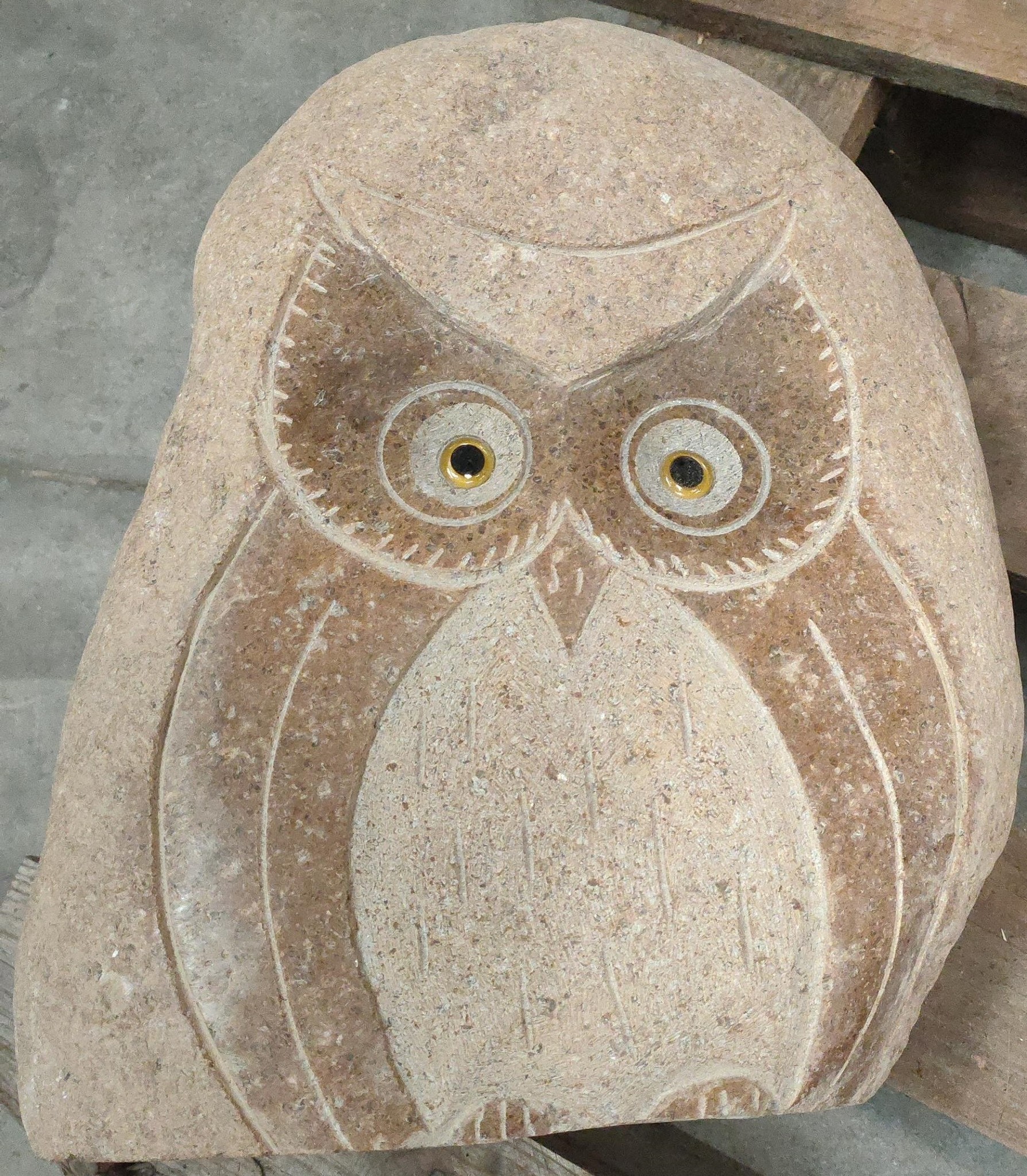 Tierurne, mit schöner Abbildung einer Eule auf Stein, handgefertigt auf einem Felsblock von ca.