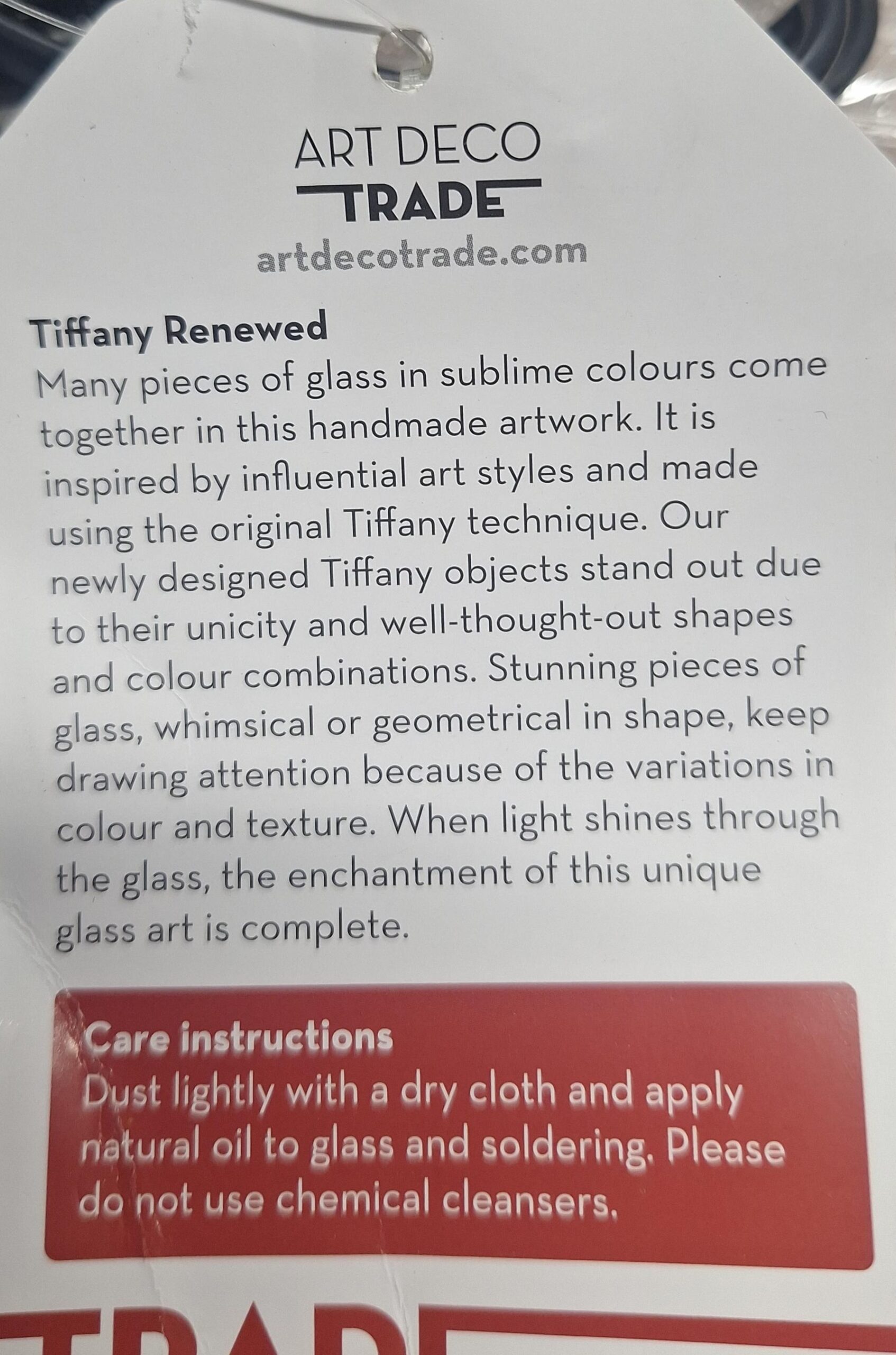 Die Tiffany-Artikel leuchten so schön, weil sie Dutzende, in manchen Fällen sogar Hunderte von verschiedenen Glasstücken enthalten: in allen Farben des Regenbogens. Jedes geschnittene und geschliffene Stück wird mit Kupferfolie umwickelt. Danach werden die kleinen Glasstücke mit Lötwasser eingerieben und in einer Form mit Lötzinn zusammengelötet. Dieses Linienmuster aus Kupferfolie ist Teil der meist prächtigen Motive auf den Lampen. Ein Prozess, der mit Plastik nicht möglich ist!