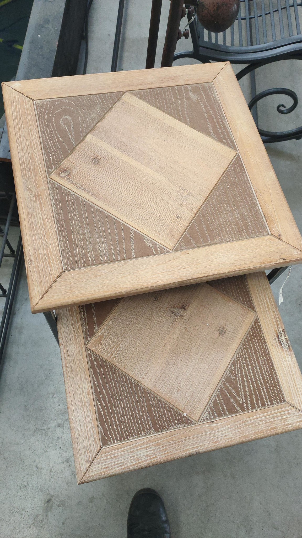 Holen Sie sich pure Schönheit in Ihr Haus oder Ihren Garten mit diesem modernen quadratischen Beistelltischset im industriellen Stil mit Holzplatten im Landhausstil. Dieses industrielle Tischset ist 2-teilig und kann zusammengeschoben werden.