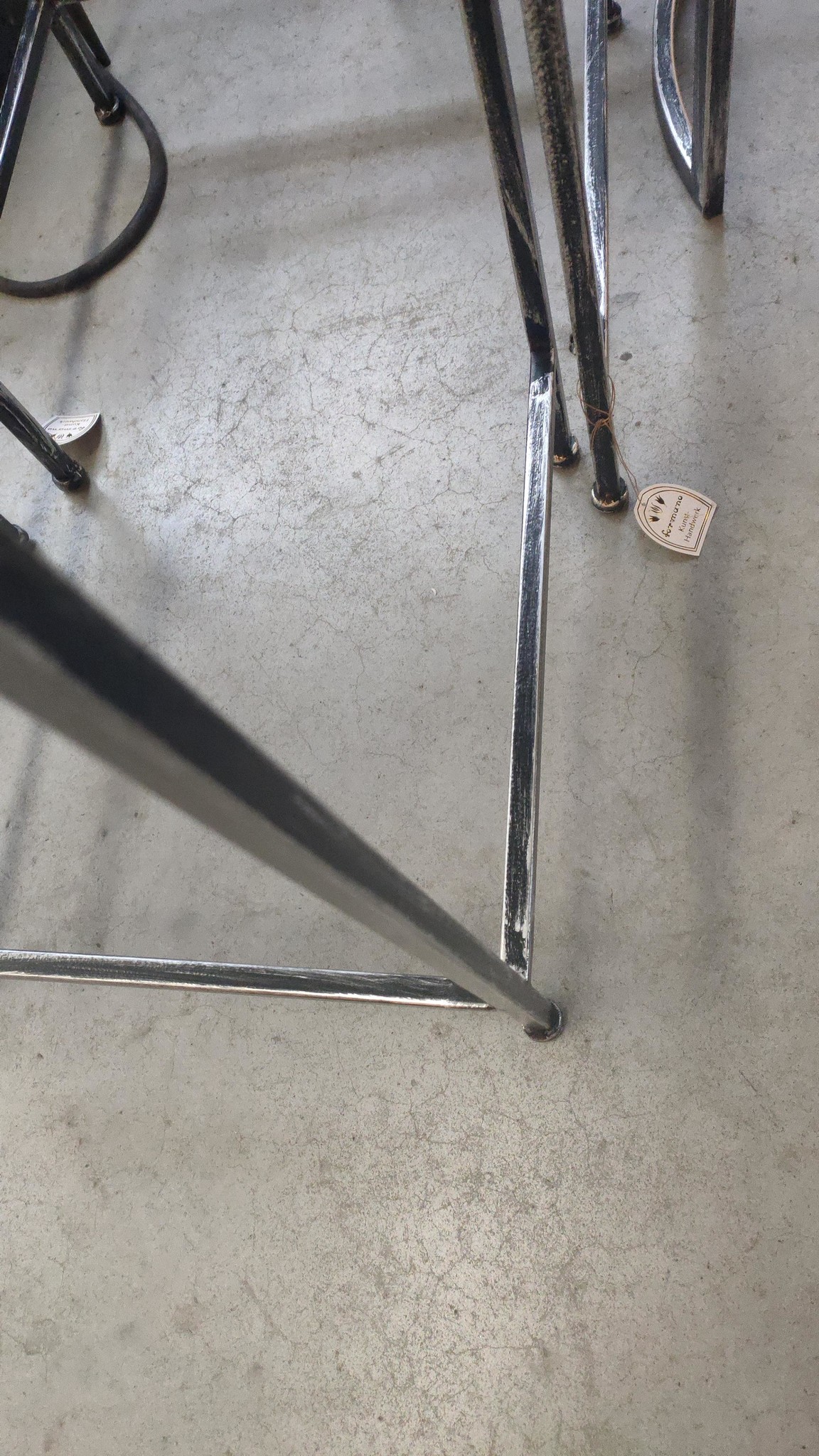 Hergestellt aus 12mm Stahlrohr. Schwarz beschichtet, mit einem silbernen Finish auf den Eisenbeschlägen. Oben ist eine 14 mm dicke MDF-Platte angebracht, die eine ländlich anmutende Blockform hat.