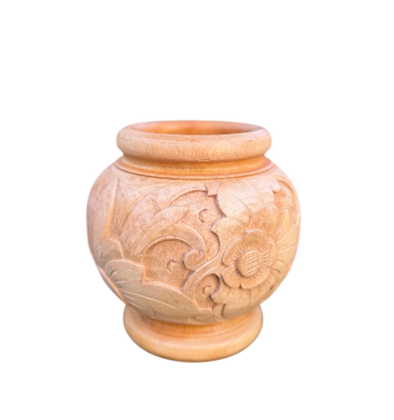 Schöner Holztopf, handgefertigt aus massivem Mahagoni. Viele Stunden Schnitzarbeit stecken in diesem Holzobjekt.