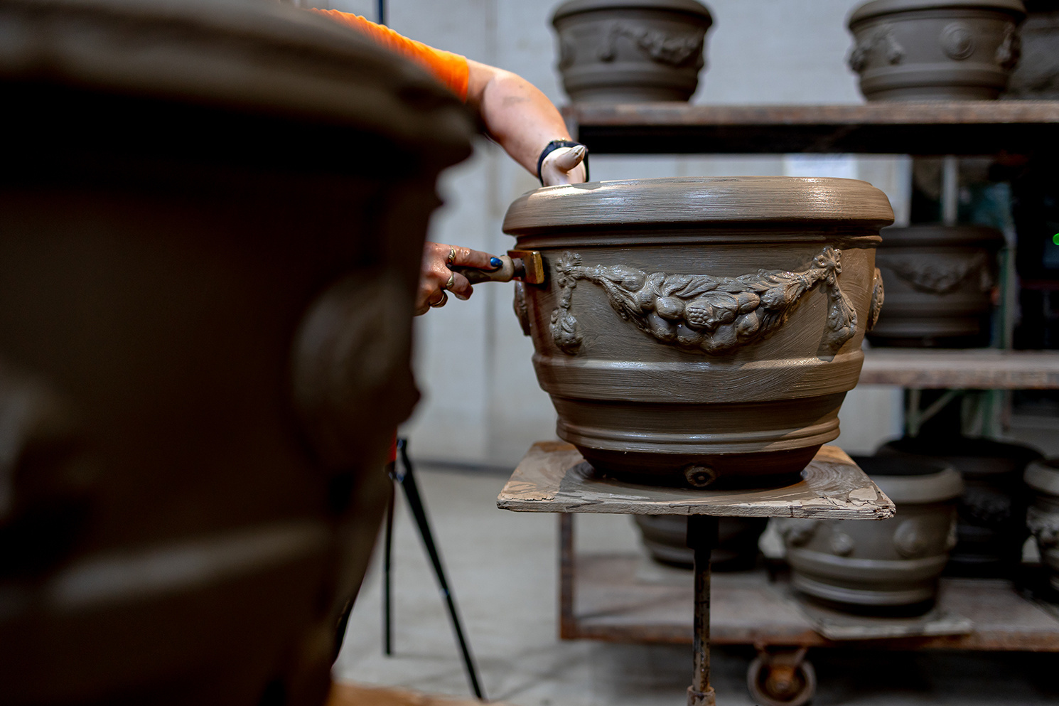 Dieser dicke und robuste, handgedrehte Terrakotta-Topf hat ein vertrautes, klassisches Aussehen. Der Mittelmeerraum bestimmt das Aussehen dieses runden Topfes. Dieser Blumentopf aus Terrakotta wird in der italienischen Region Toskana hergestellt, die für ihre einzigartige grün-braune Tonfarbe und ihre sehr hohe Qualität bekannt ist. Dieser Ton verfärbt sich, nachdem er im Ofen gewesen ist. Dies und die Tatsache, dass diese Serie von Töpfen bei einer sehr hohen Temperatur von 1150 Grad Celsius gebrannt wird, macht diese Töpfe geeignet, viele Jahre lang im Freien zu stehen. Die Linie Doppio bordo liscio zeichnet sich durch ihren glatten, doppelten Rand an der Kanne aus.