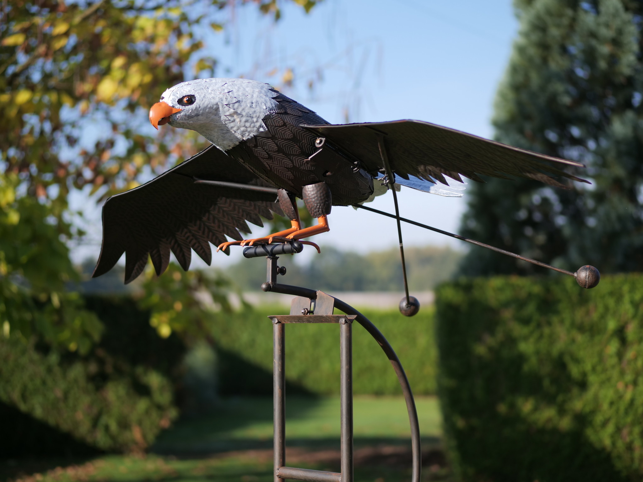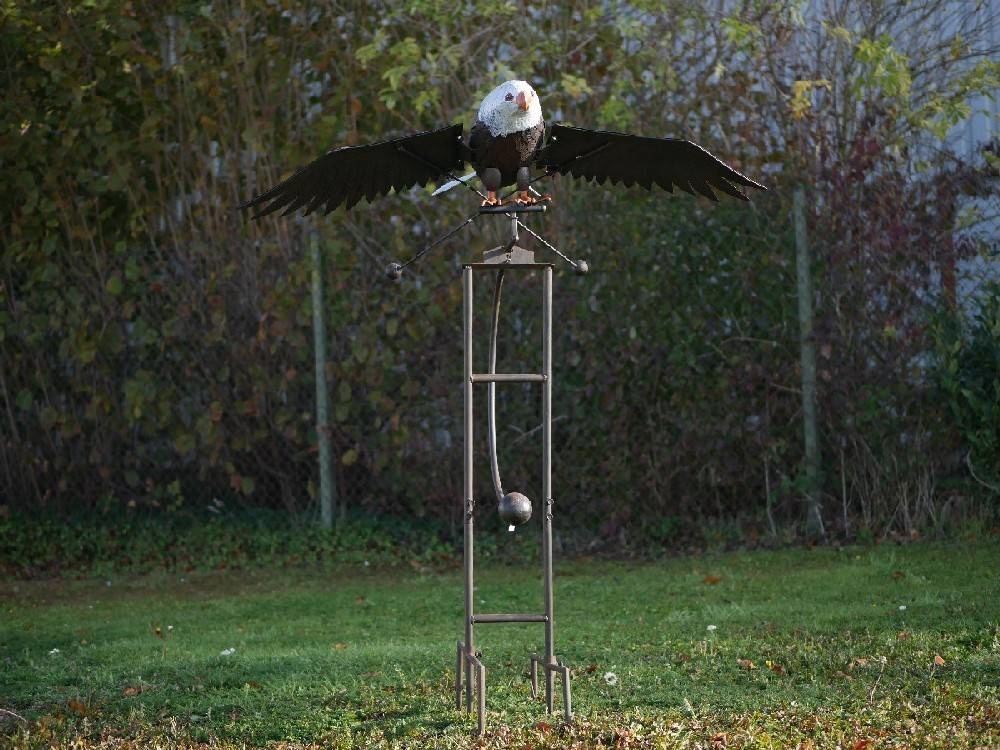 Überdimensional groß ist dieses Stück Gartendekoration. Dieser große Adler macht Flugbewegungen mit seinen Flügeln, indem er Wind und Gleichgewichtsgewichte an den Flügeln und am Schwanz benutzt. Bei starkem Wind fliegt dieser Modelladler endlos auf und ab.Gegengewichte in Form von Metallkugeln. Vollständig von Hand aus Eisen gefertigt.