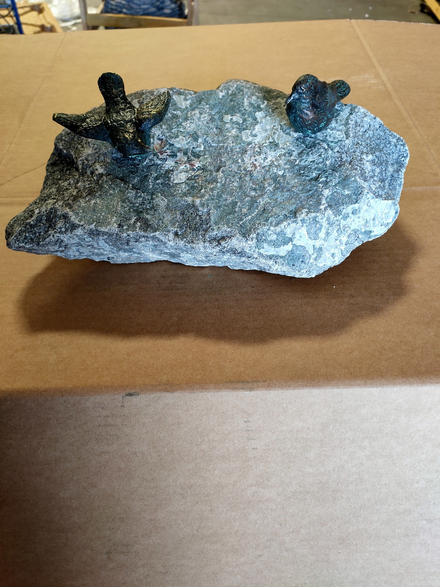 Diese Bronzevögel, die auf einem schwarzen Waldstein montiert sind, sind ein dekoratives Objekt in jedem Garten. Diese Vögel finden sicher ihren Platz in modernen, ländlichen oder klassischen Gärten. Schön zu bekommen und zu geben.